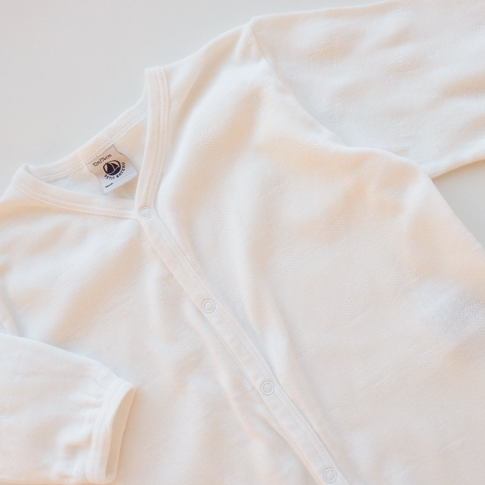Pyjama, dors-bien en coton, coloris blanc uni, avec motifs bateau ton sur ton. Boutons pressions au devant. Très mignon. Mixte.