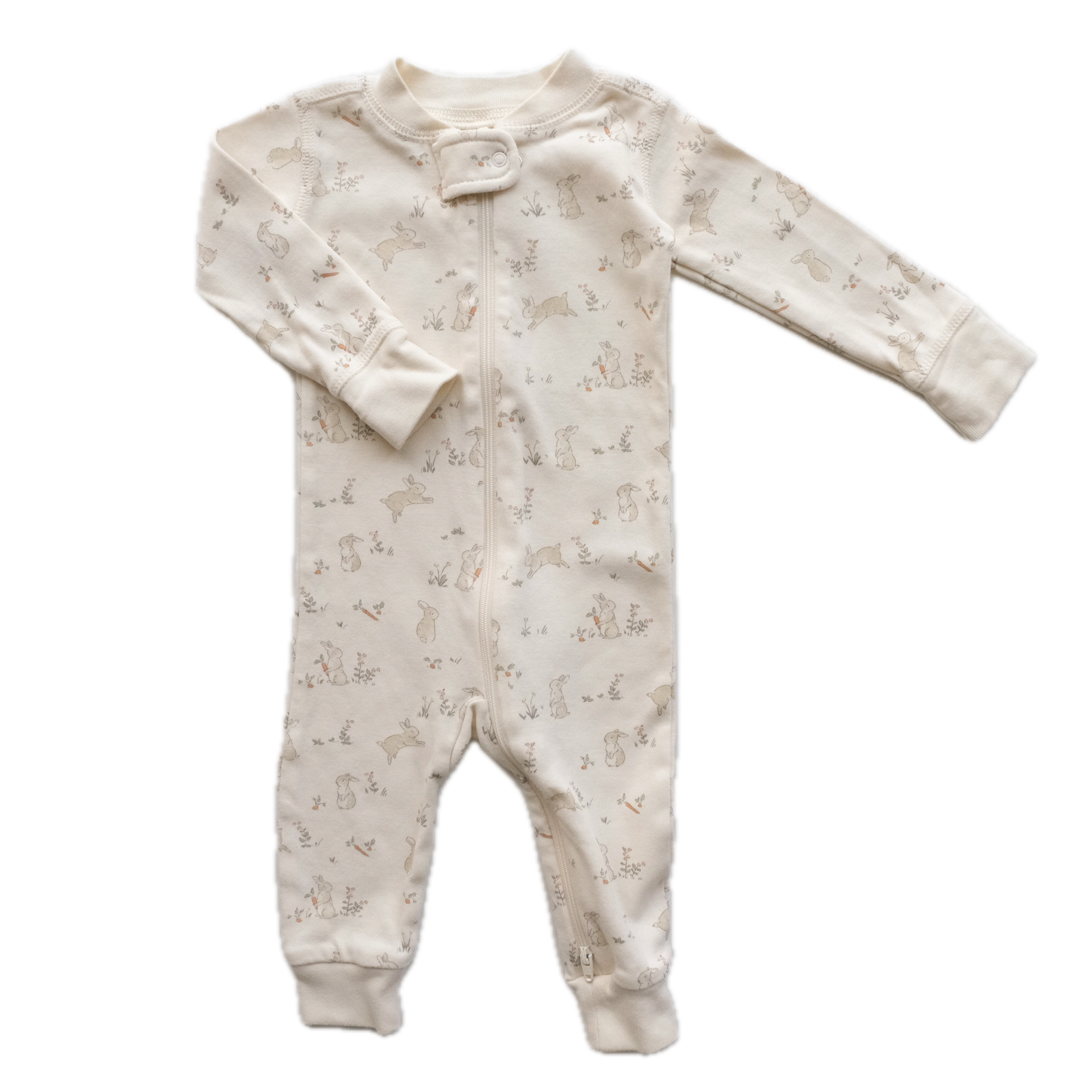 Adorable pyjama, dors-bien sans pieds, 100% coton biologique. Coloris crème avec un adorable imprimé lapin et carottes. Zip au devant + patte avec boutons pressions au col. Trop beau et Mixte.