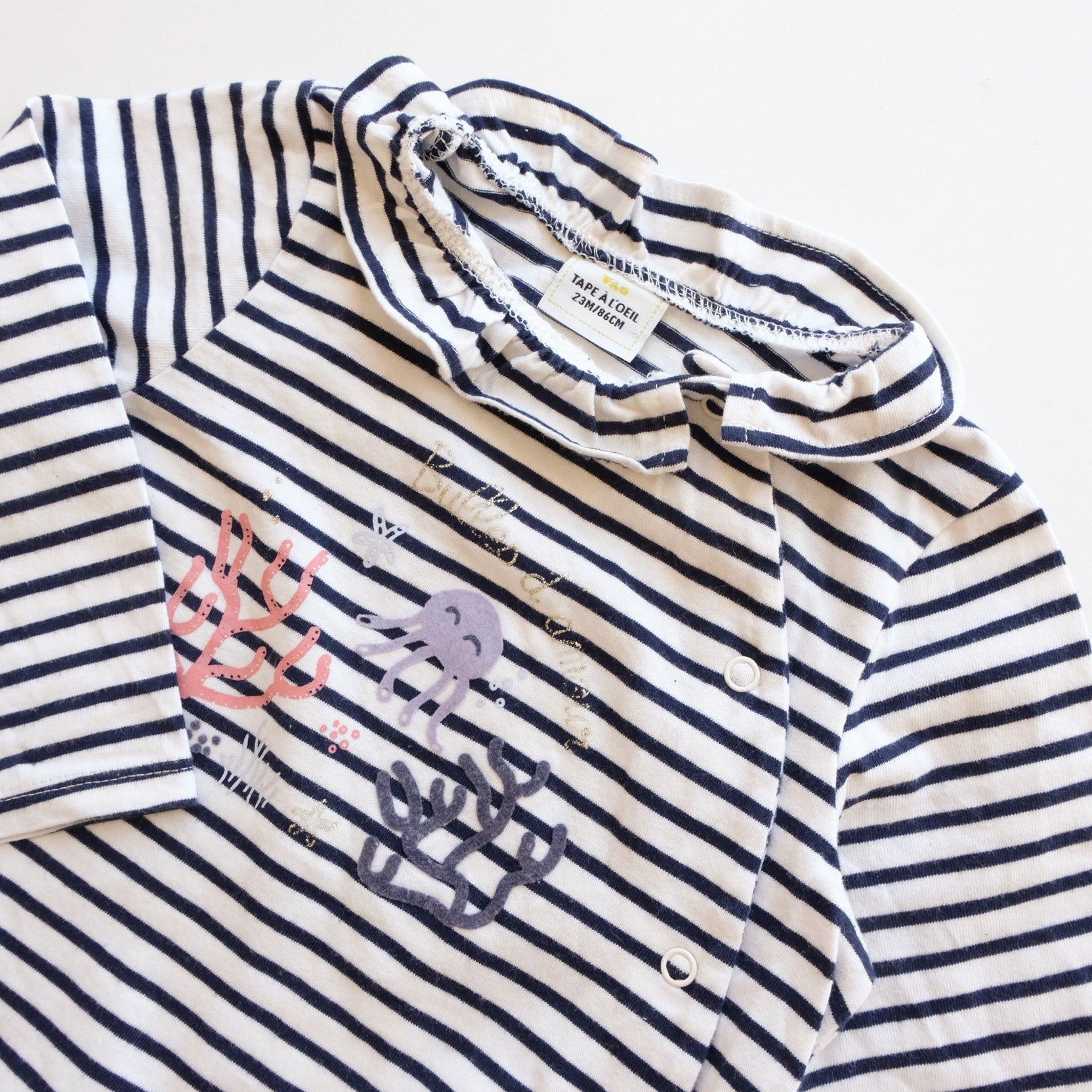Pyjama, dors-bien en coton, coloris blanc, rayures bleu marine all over. Boutons pressions au devant. Petit col froufrou. Inscription "bulles d'amour' en doré au devant.