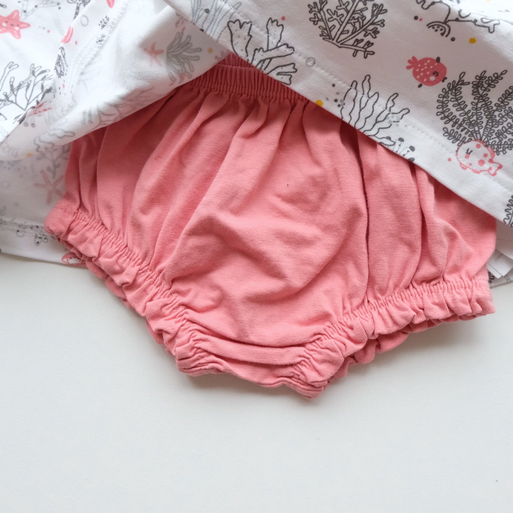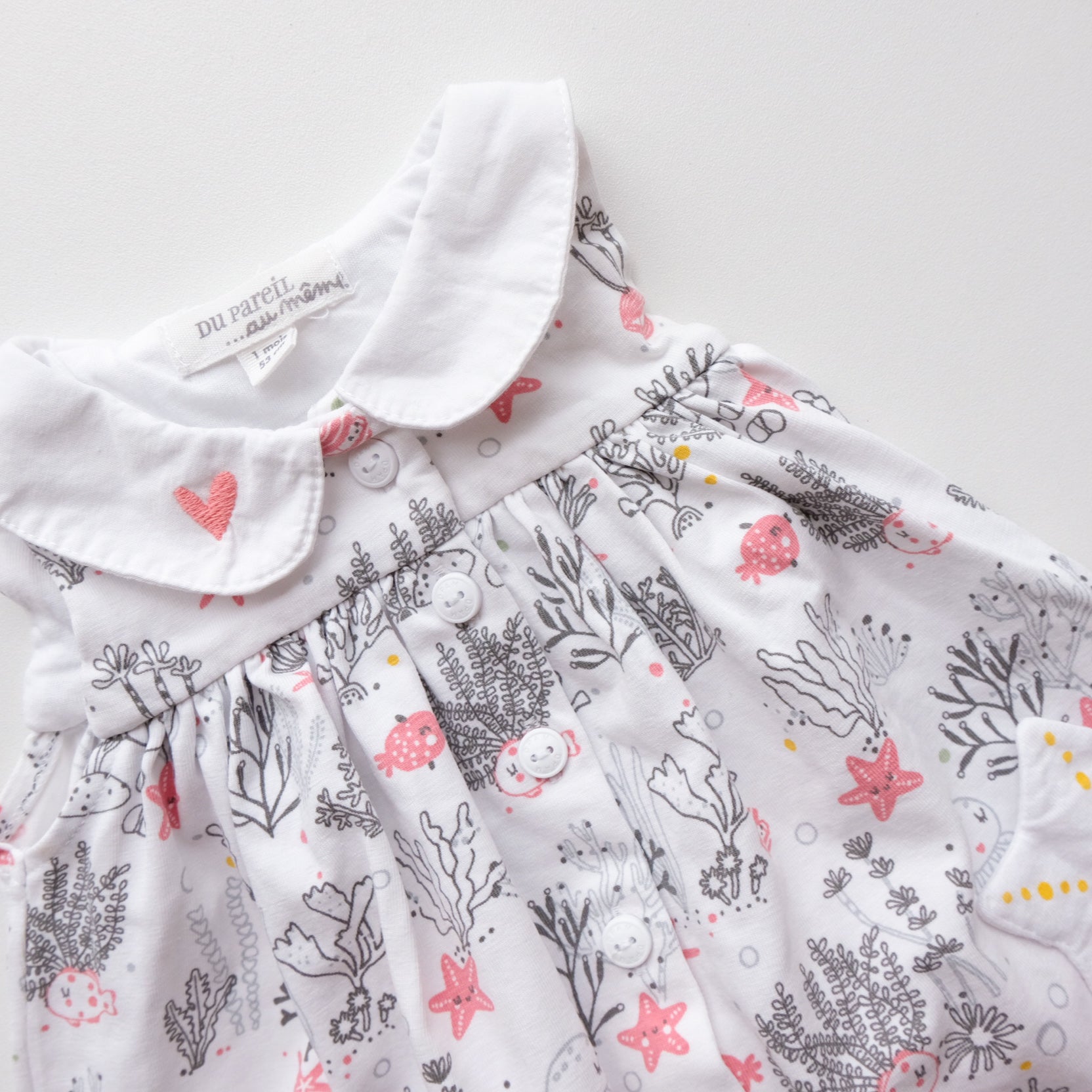 Adorable petite robe été sans manches, en coton blanc, imprimé sur le thème de la mer, petites touches rose. Joli petit col blanc avec coeur brodé rose. Boutonnière au devant. Jolies petites poches en formes d'étoiles. Petit bloomer rose en coton assorti. Adorable !