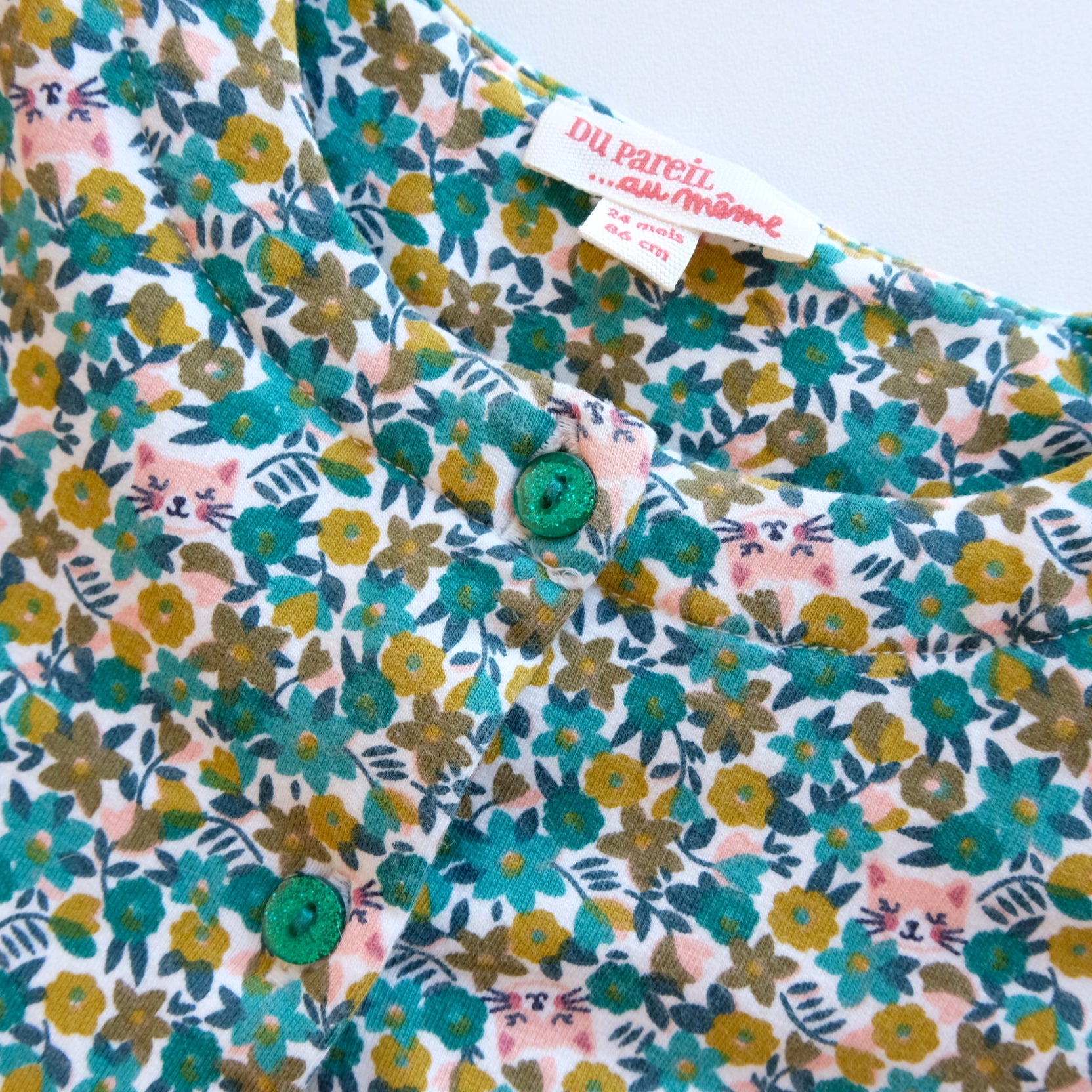 Robe à manches longues en coton épais chaud. Coloris dans les tons verts, imprimé fleuri all over. Jolie boutons vert paillettes au devant. Très jolie !