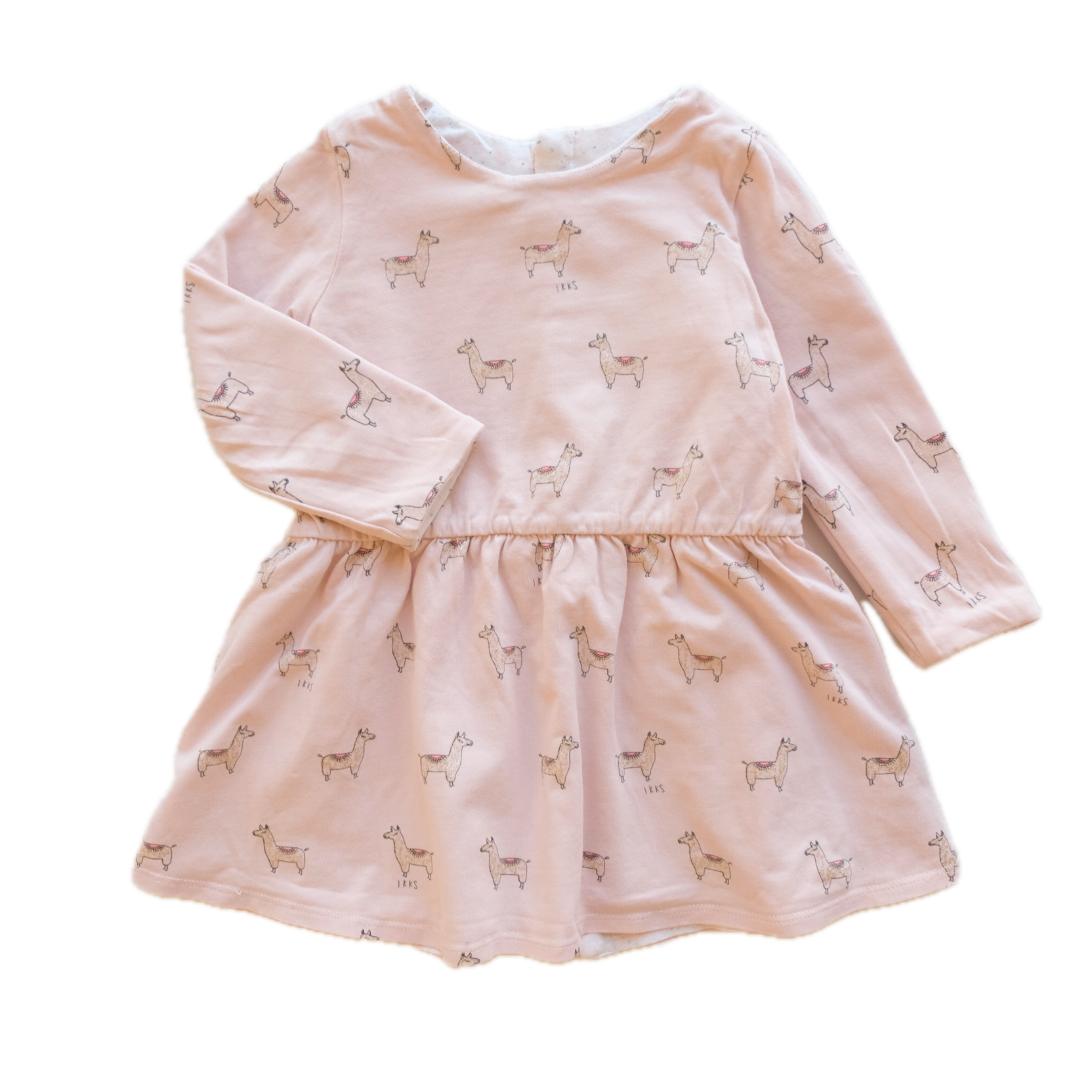 Robe à manches longues en coton, réversible : un côté rose clair imprimé lama all over et un côté blanc chiné. Boutons pressions tout le long du dos. Très chou !