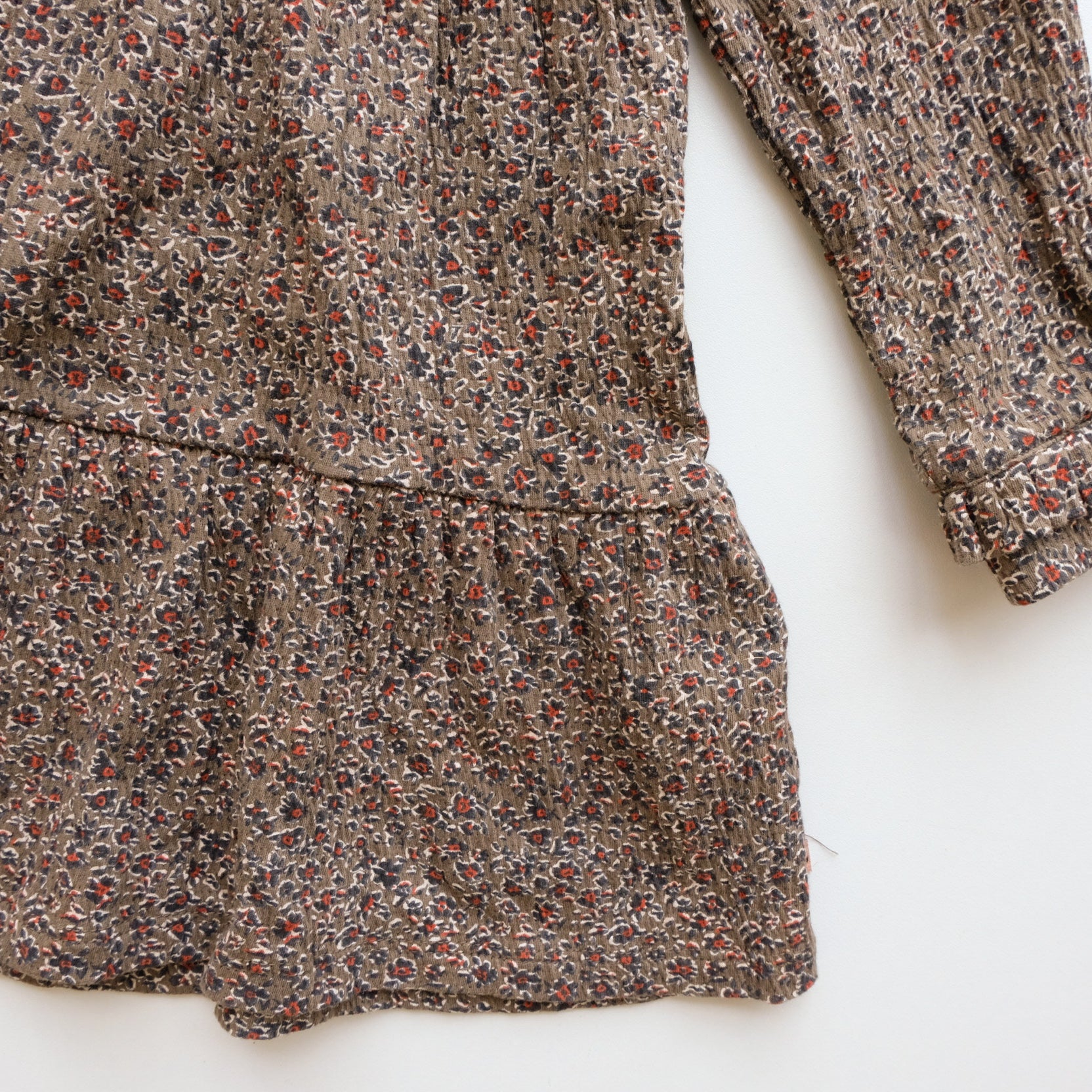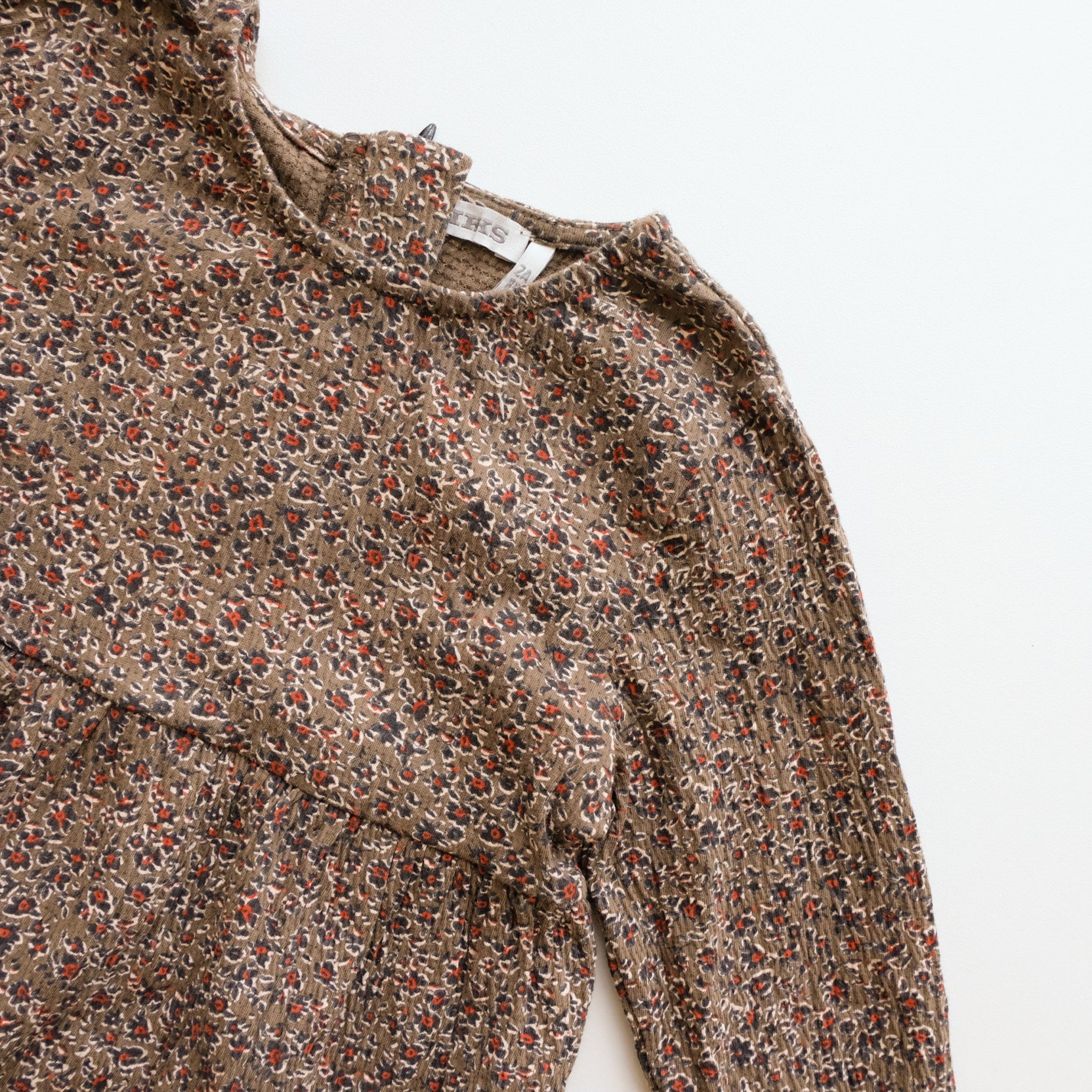 Robe à manches longues en coton gaufré, coloris kaki, imprimé fleuri all over. Très jolie !