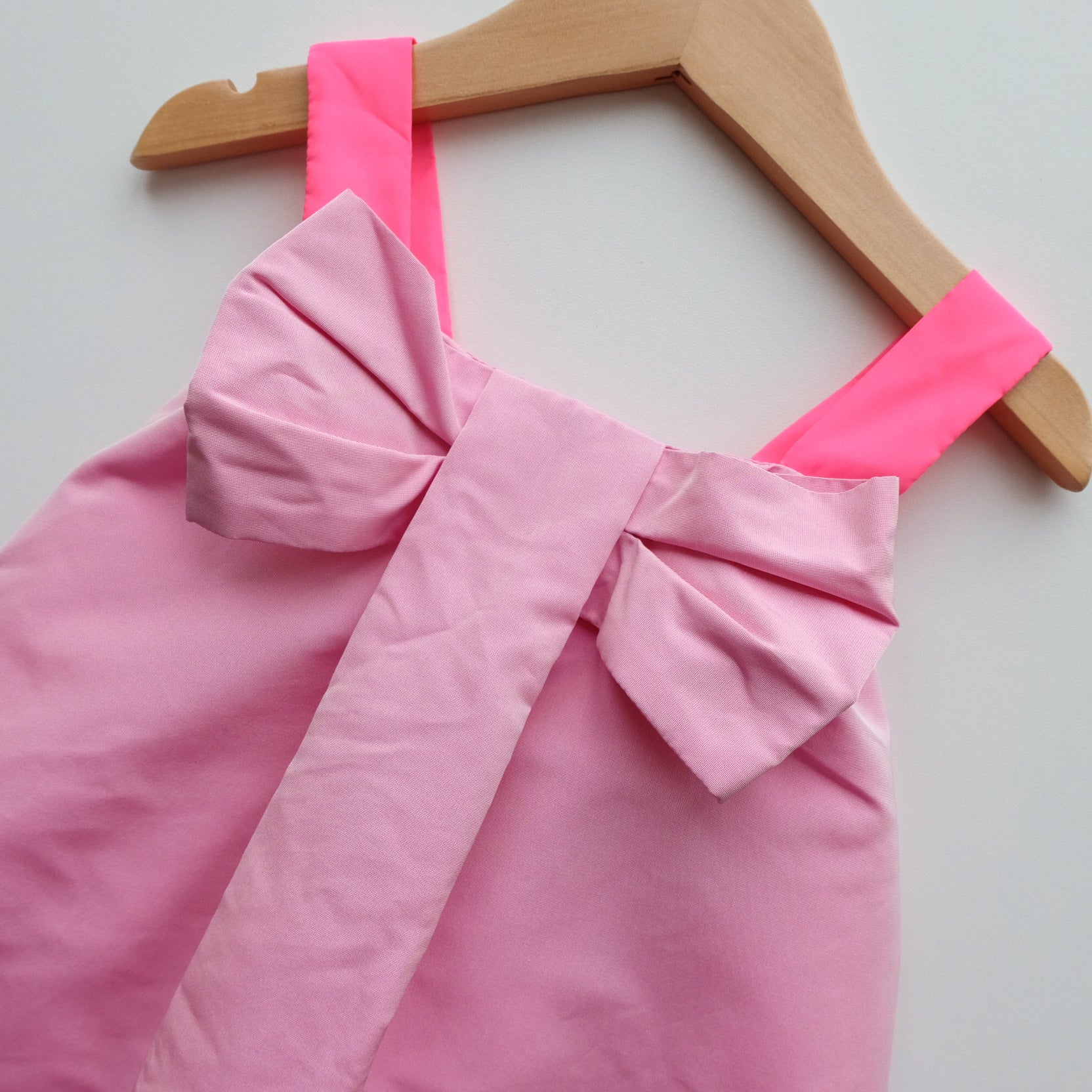 Magnifique robe rose, parfaite pour une cérémonie. Tissu rose légèrement brillant. Gros noeud fantaisie au devant. Bretelles coloris rose flashy en contraste. Zip au dos. Elles est SUPERBE !