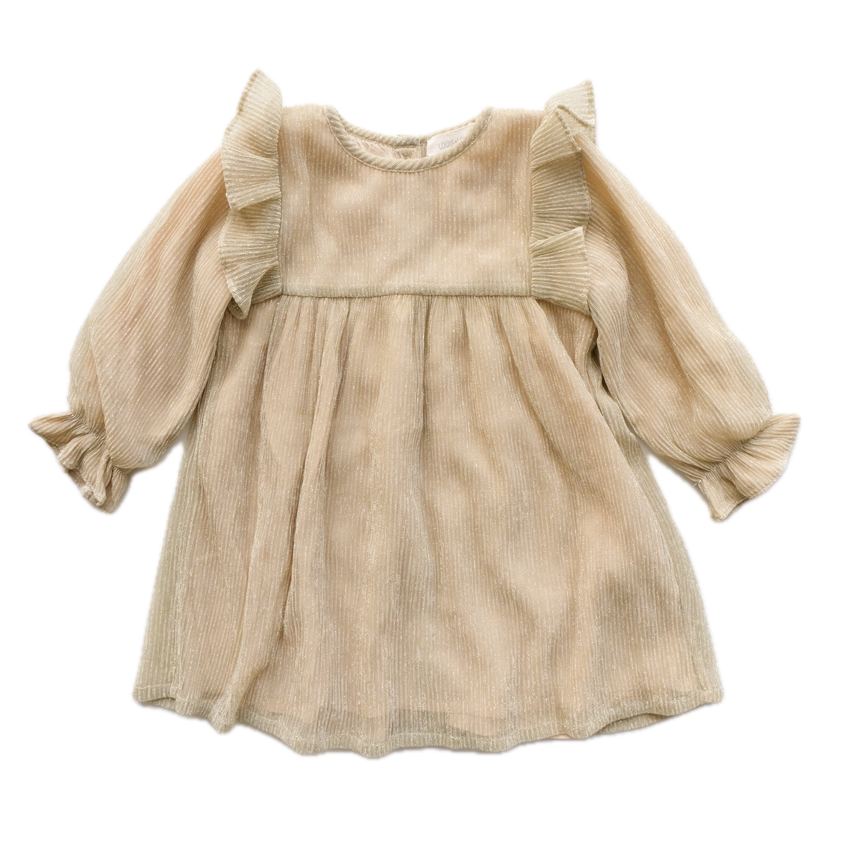 Superbe robe fluide à manches longues élastiquées, en tulle doré. Doublure intérieure en coton. Boutonnière tout le long du dos. Volants au niveau des épaules. Magnifique, une vraie robe de princesse.