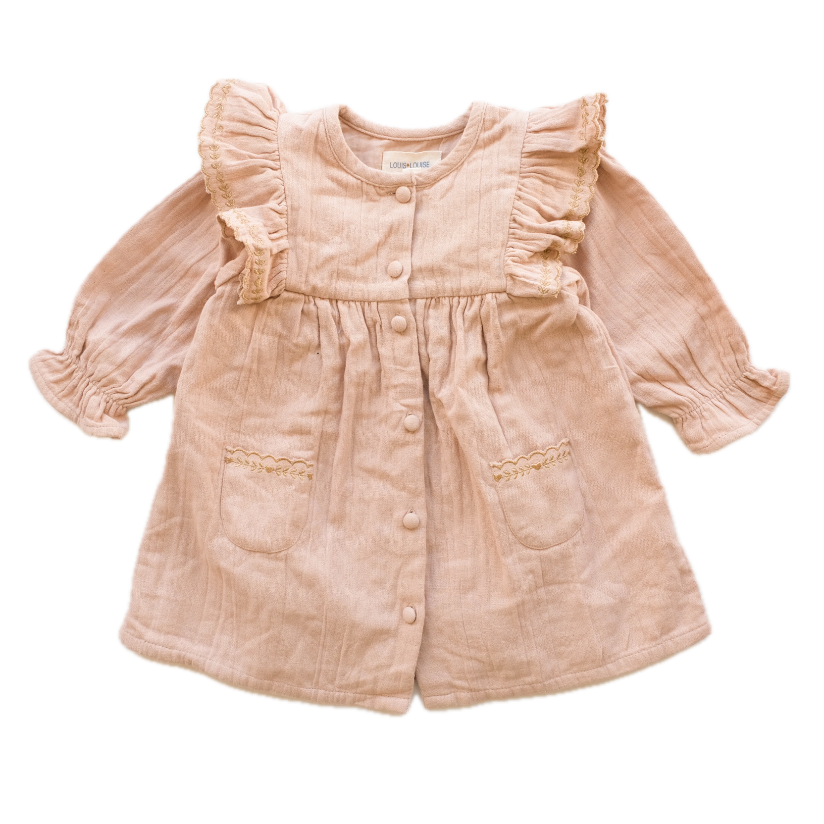 Superbe robe à manches longues élastiquées, en mousseline de coton, coloris beige. Boutonnière au devant. Joli volant au devant avec broderies dorées. Très belle !