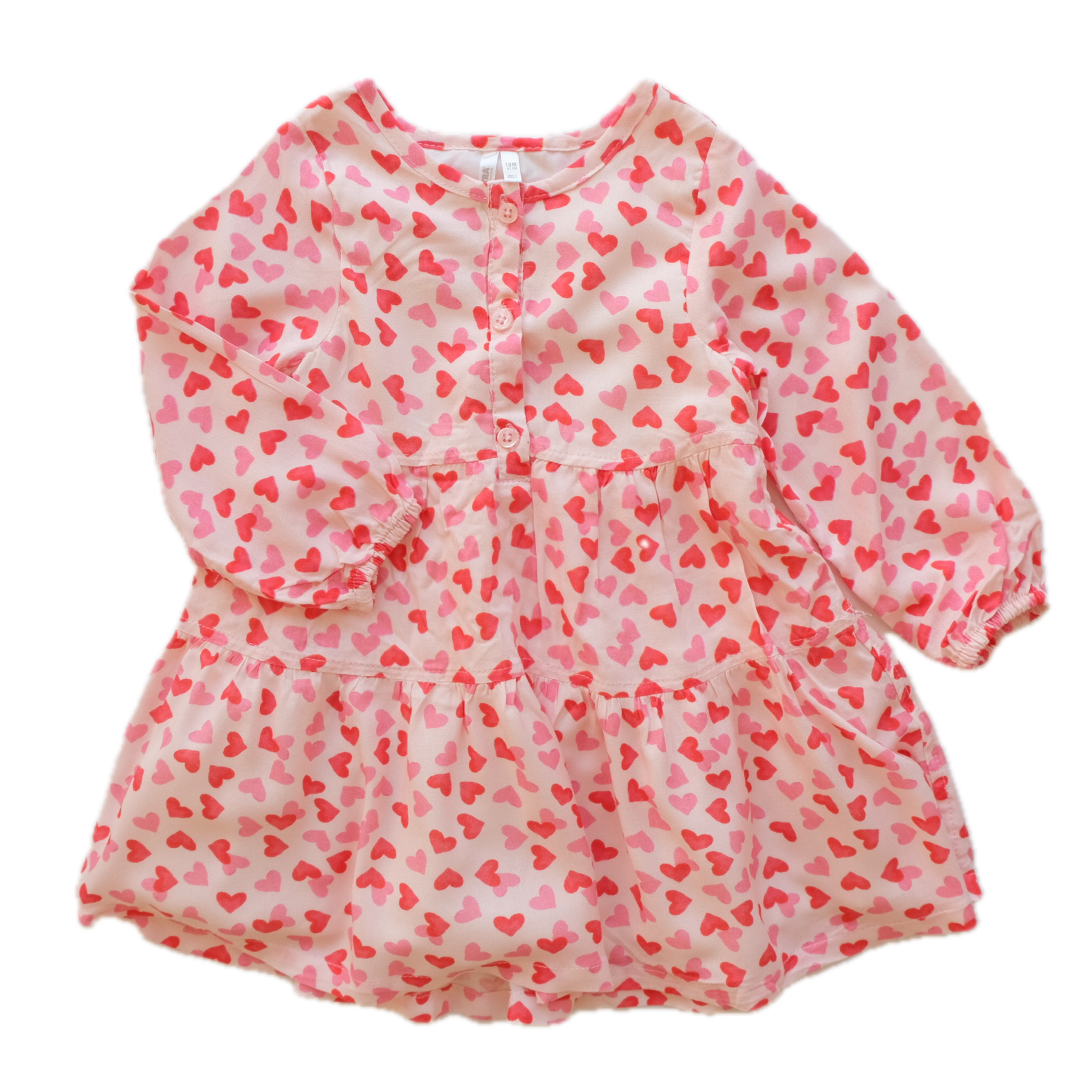 Robe à manches longues en coton, imprimé coeurs rose et rouges all over. Manches élastiquée, boutonnière au devant.
