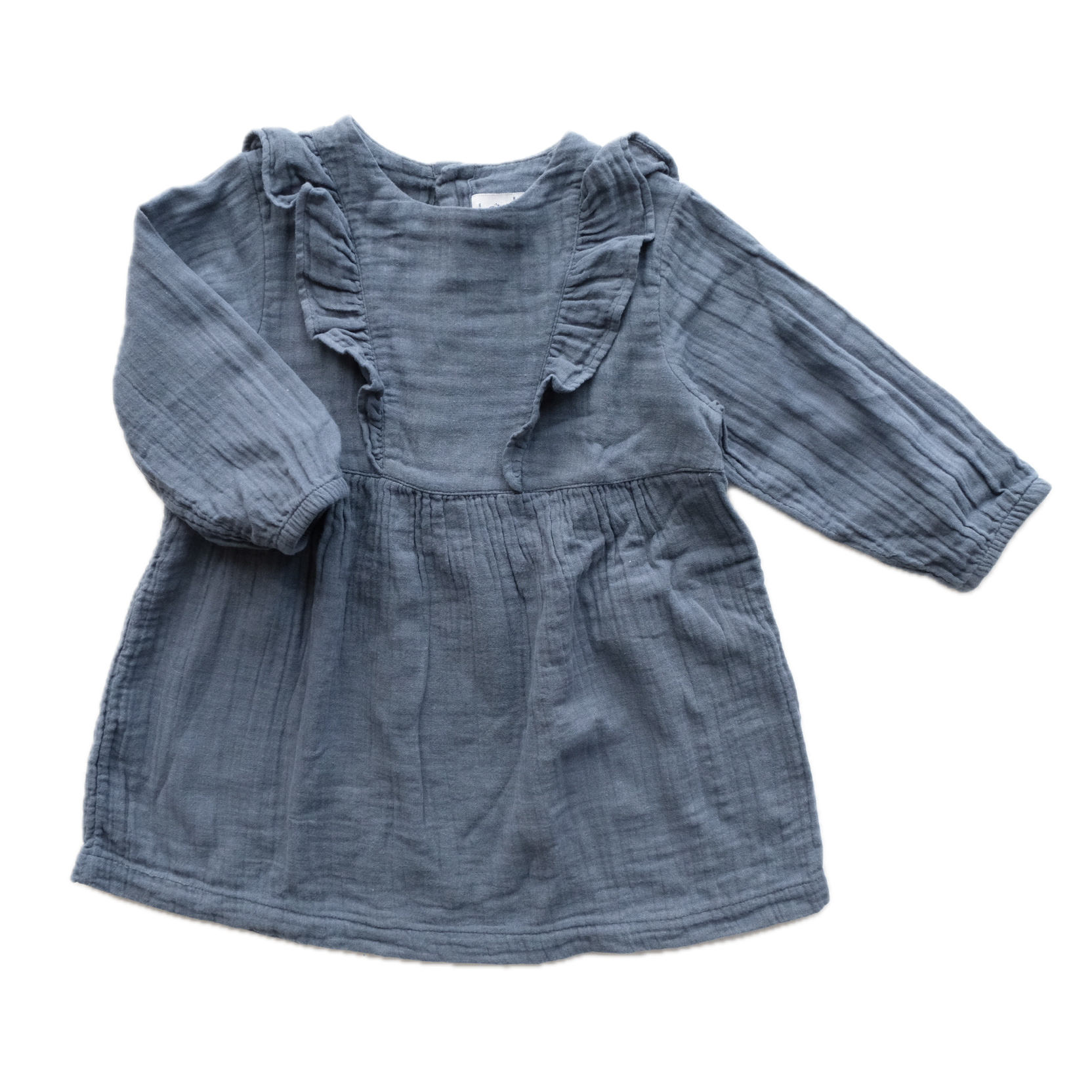 Robe à manches longues en mousseline de coton biologique, coloris bleu orage uni. Manches élastiquées. Boutonnière en haut du dos. Petits volants au devant.