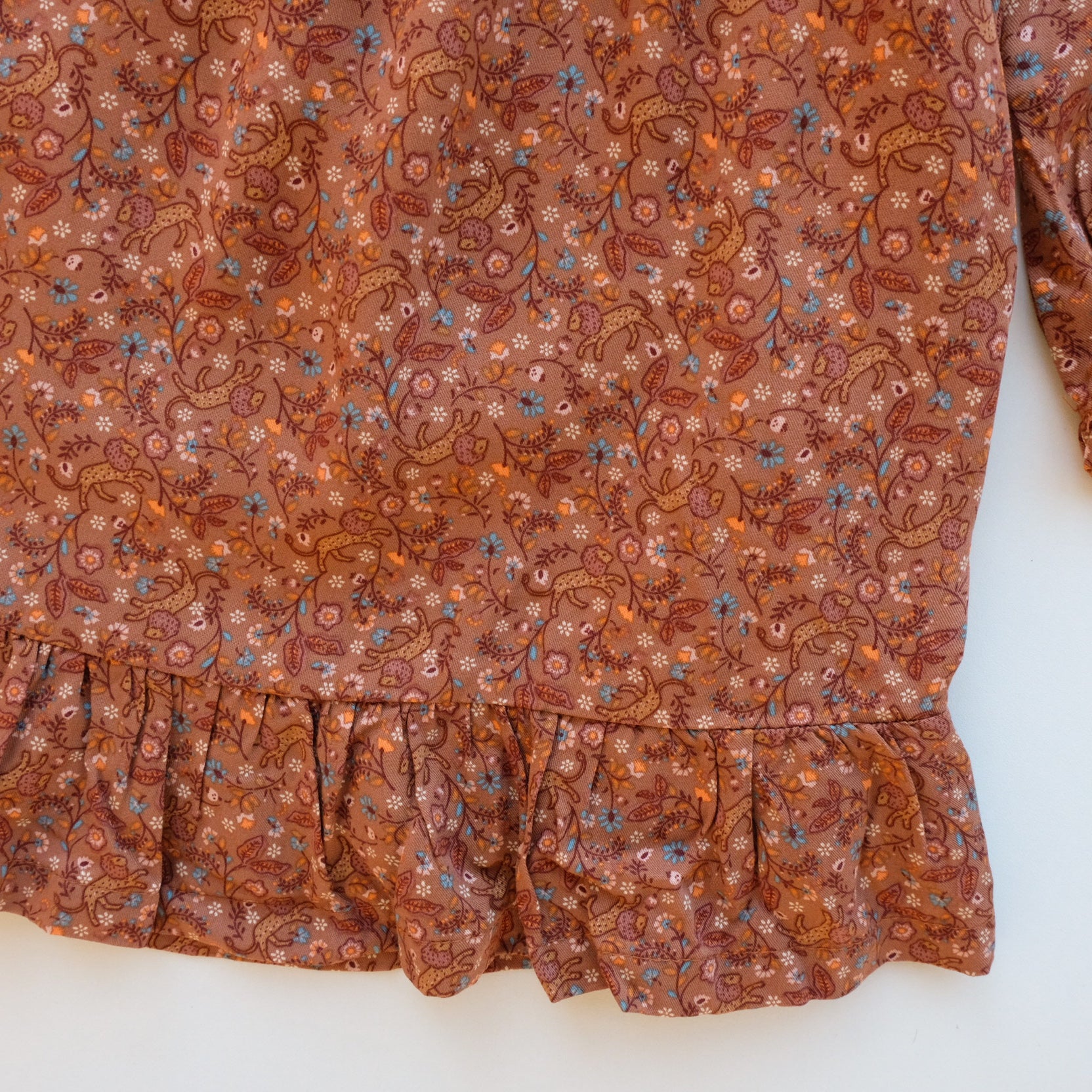 Superbe robe fluide (100% viscose), manches longues, coloris marron avec un bel imprimé fleuri esprit cachemire. Volant au niveau du col smocké. Zip au dos. Doublure intérieure en coton (100%). Très belle !