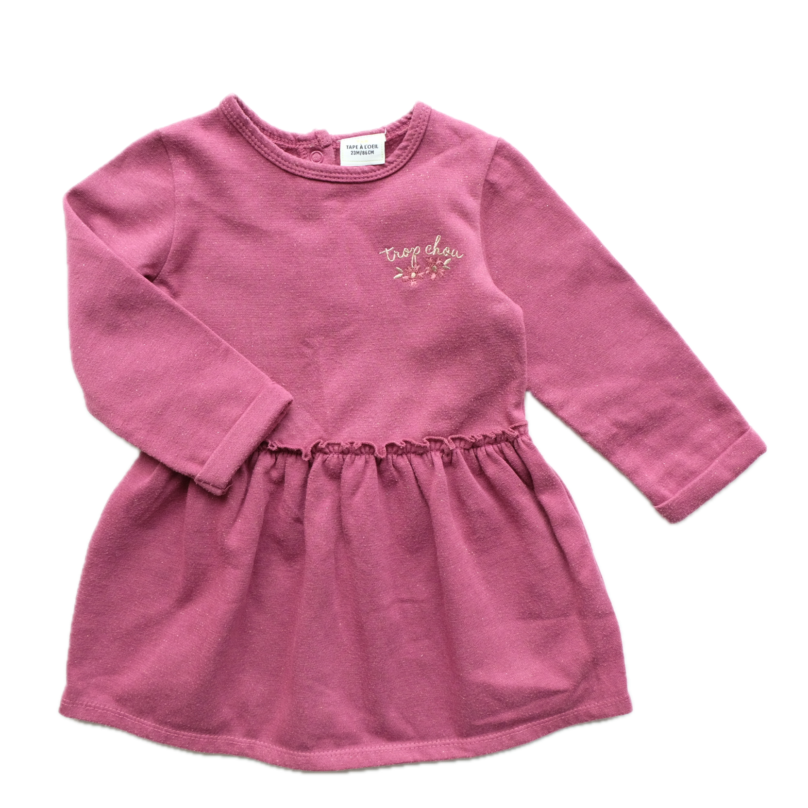 Robe à manches longues en coton, coloris rose foncé/violet. Boutons pressions en haut du dos. Détails fils fins métallisés dorés.