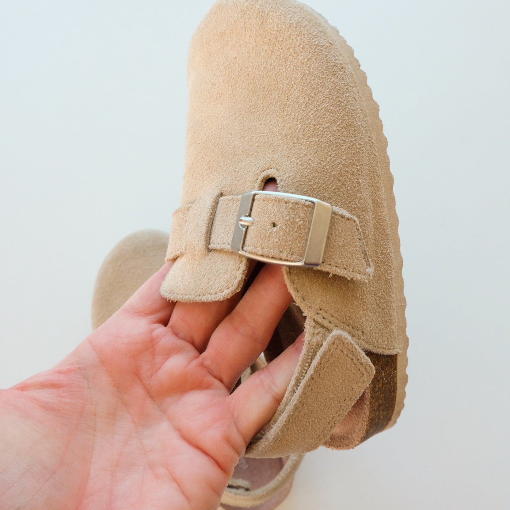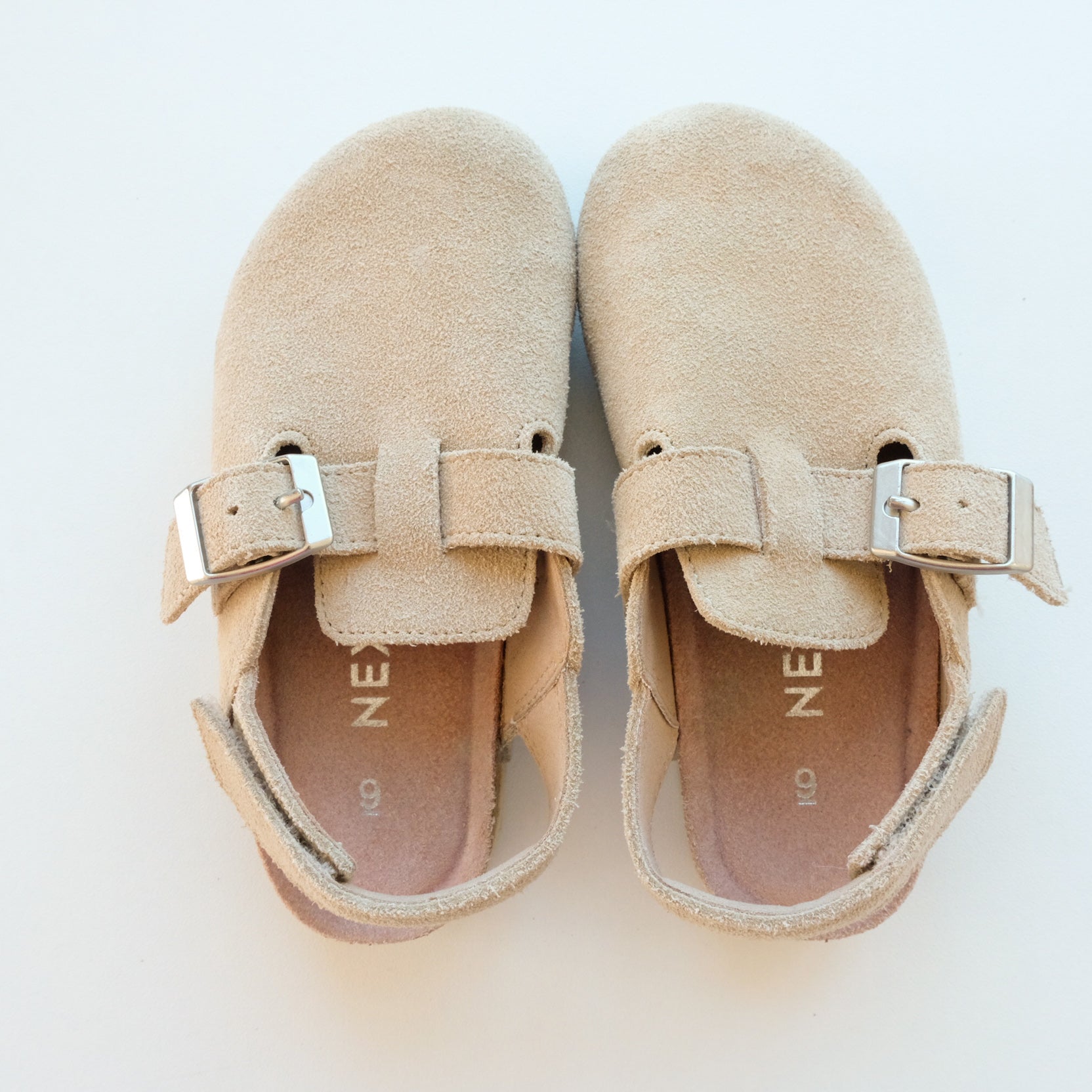 Paire de sabots Regular Fit en cuir suédé, semelle de propreté en cuir. Coloris beige. Fermeture au niveau du talon par un scratch. Mixte. Superbe état, pas d'usure de la semelle. C’est une pointure 27 mais la marque préconise de prendre une pointure au dessus. Donc sera parfait pour un 26.