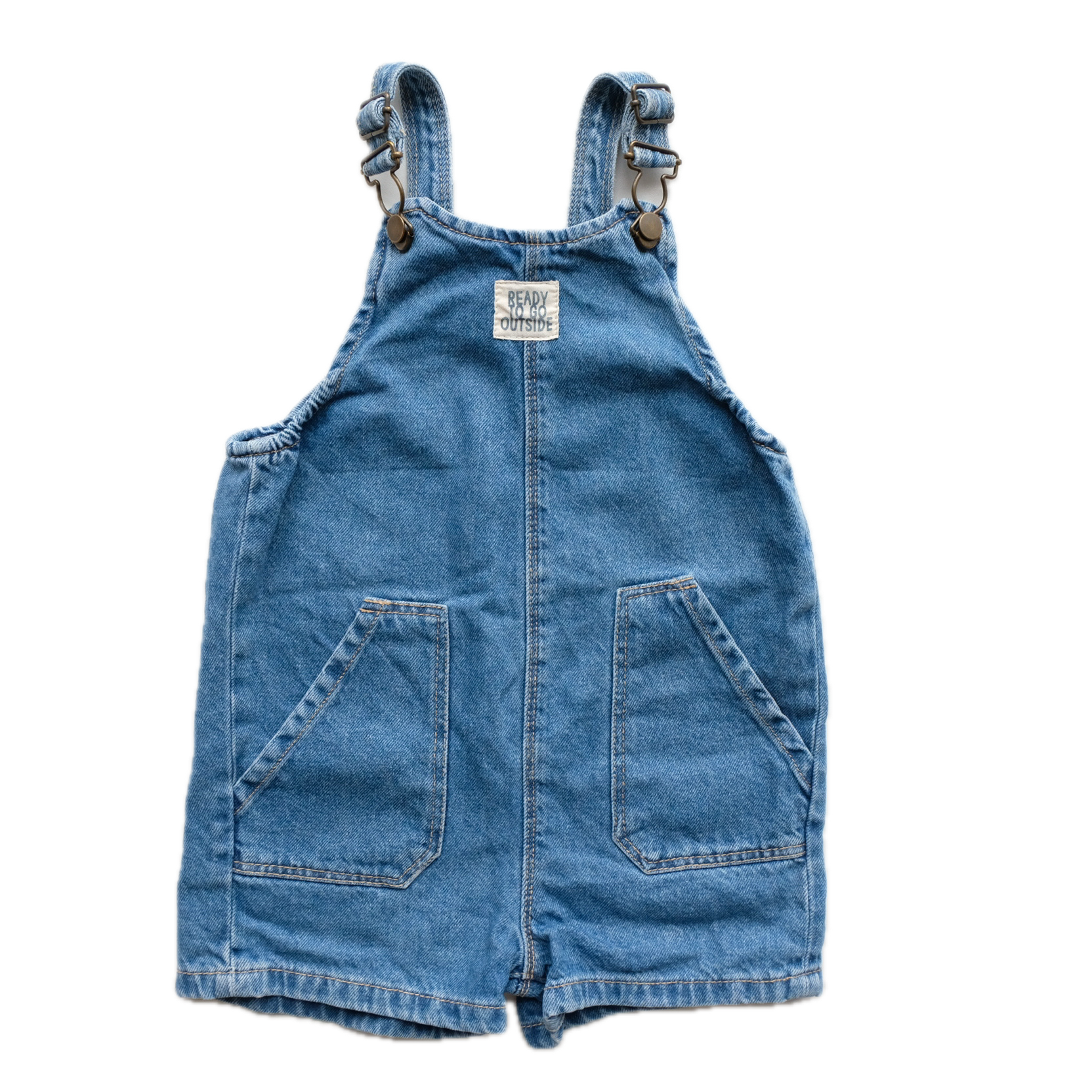 Salopette courte en jean bleu uni. Très chouette. Mixte.