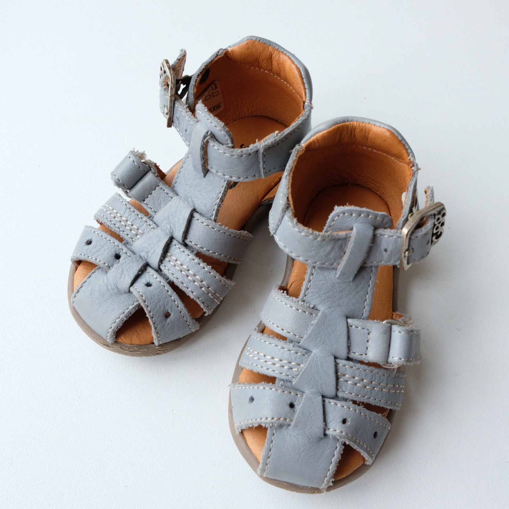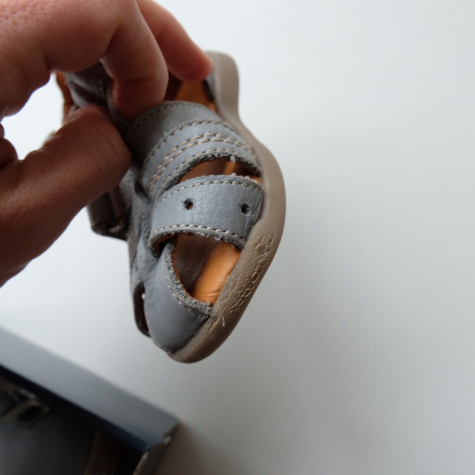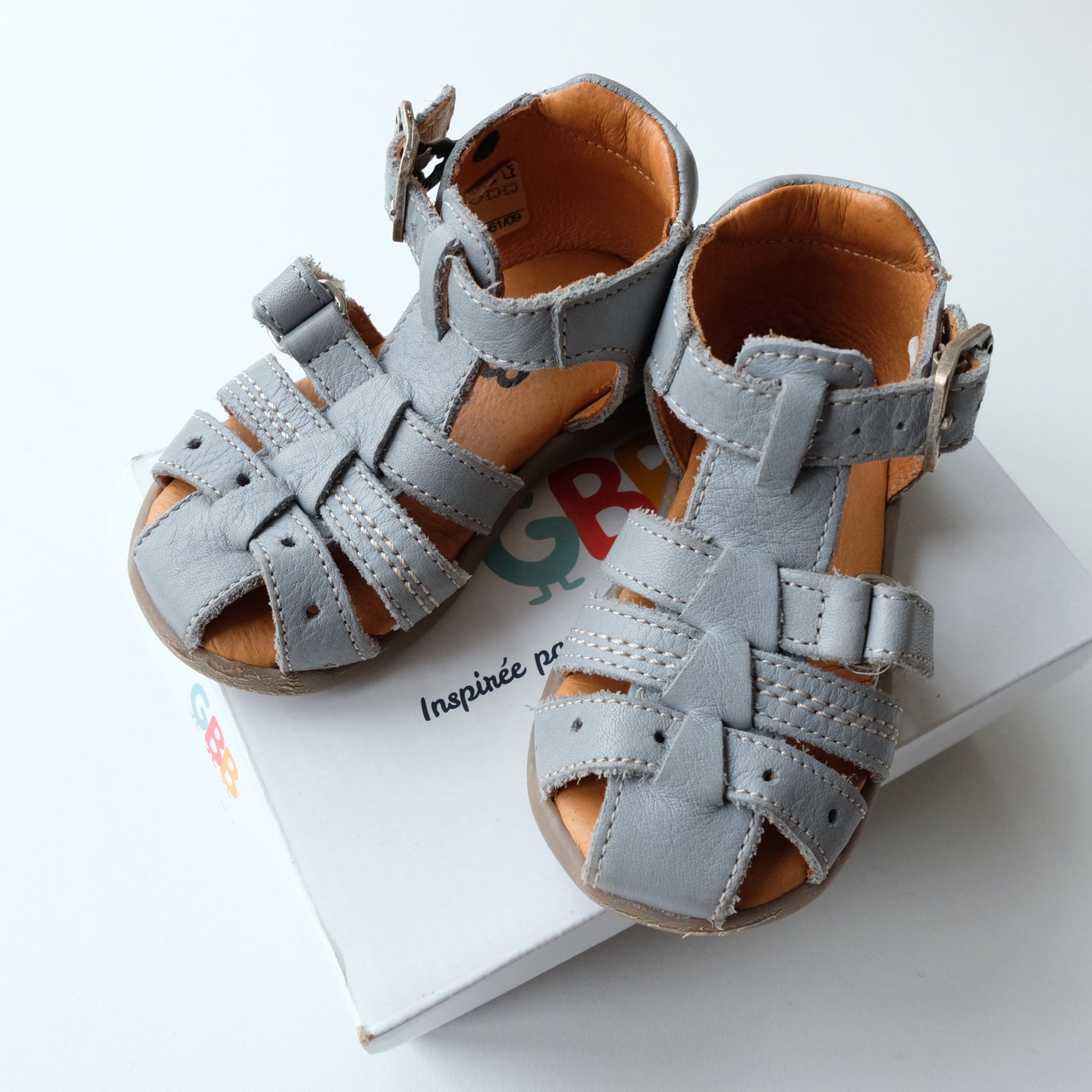 Paire de sandales en cuir (intérieur et extérieur), coloris bleu/gris. Petite éraflure du caoutchouc au niveau de la semelle au devant, sinon en excellent état.