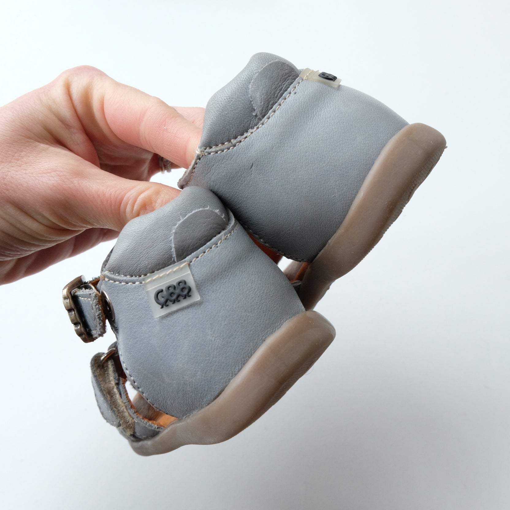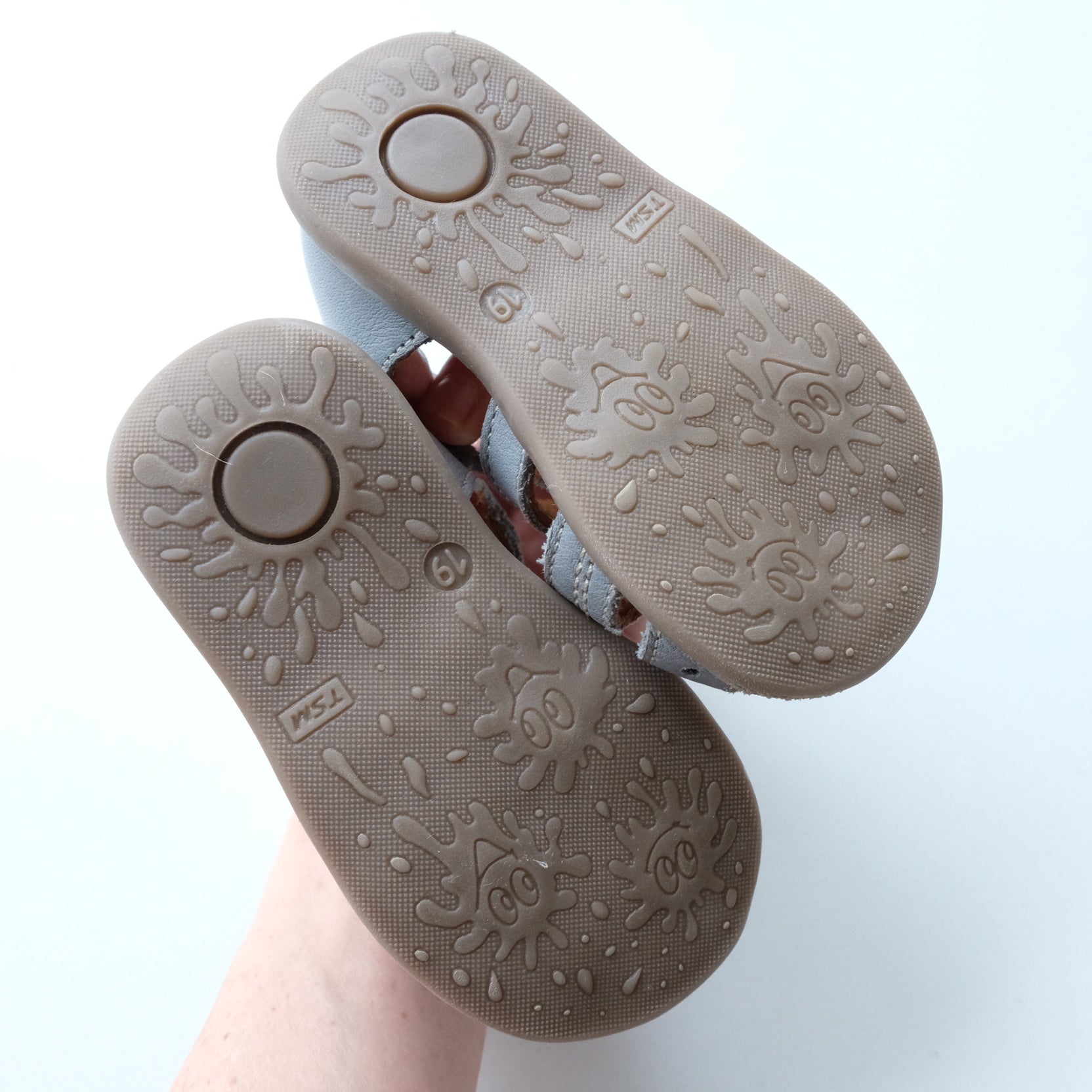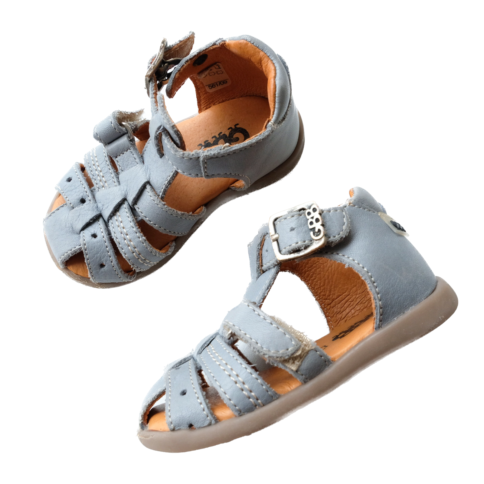 Paire de sandales en cuir (intérieur et extérieur), coloris bleu/gris. Petite éraflure du caoutchouc au niveau de la semelle au devant, sinon en excellent état.