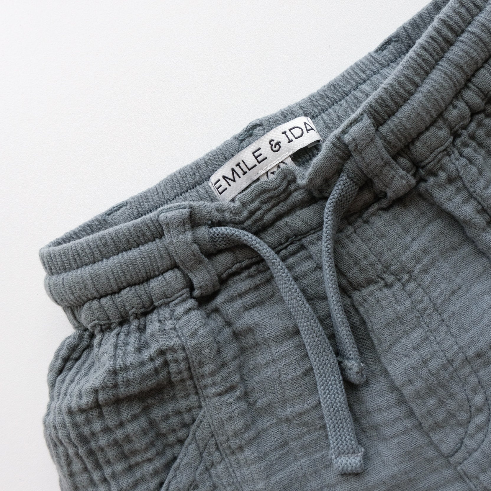 Short en gaze de coton, coloris bleu/gris uni. Taille élastiquée + cordon de serrage. Mixte.