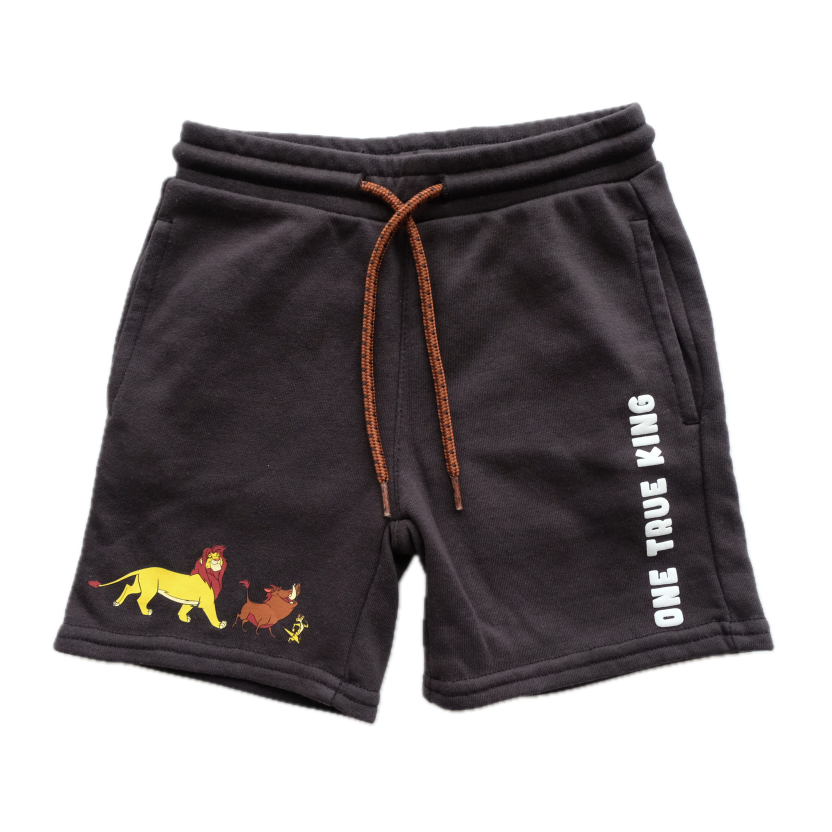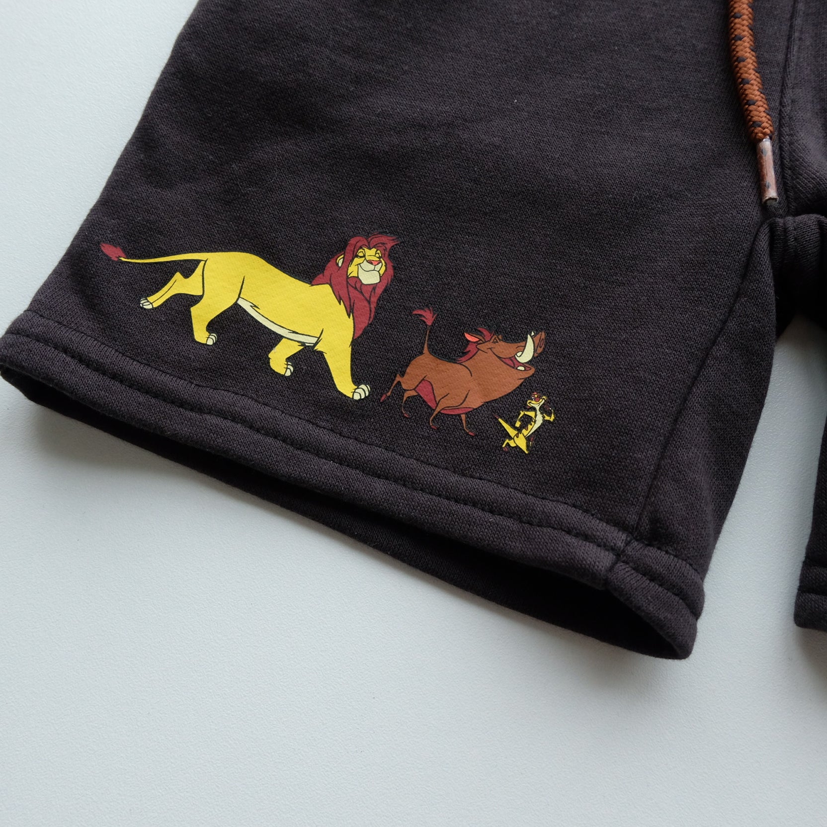 Short en coton collection Disney le roi lion, coloris noir, imprimé Simba, Timon et Pumba sur le côté. Cordon de serrage marron à la taille. Neuf sans étiquette.