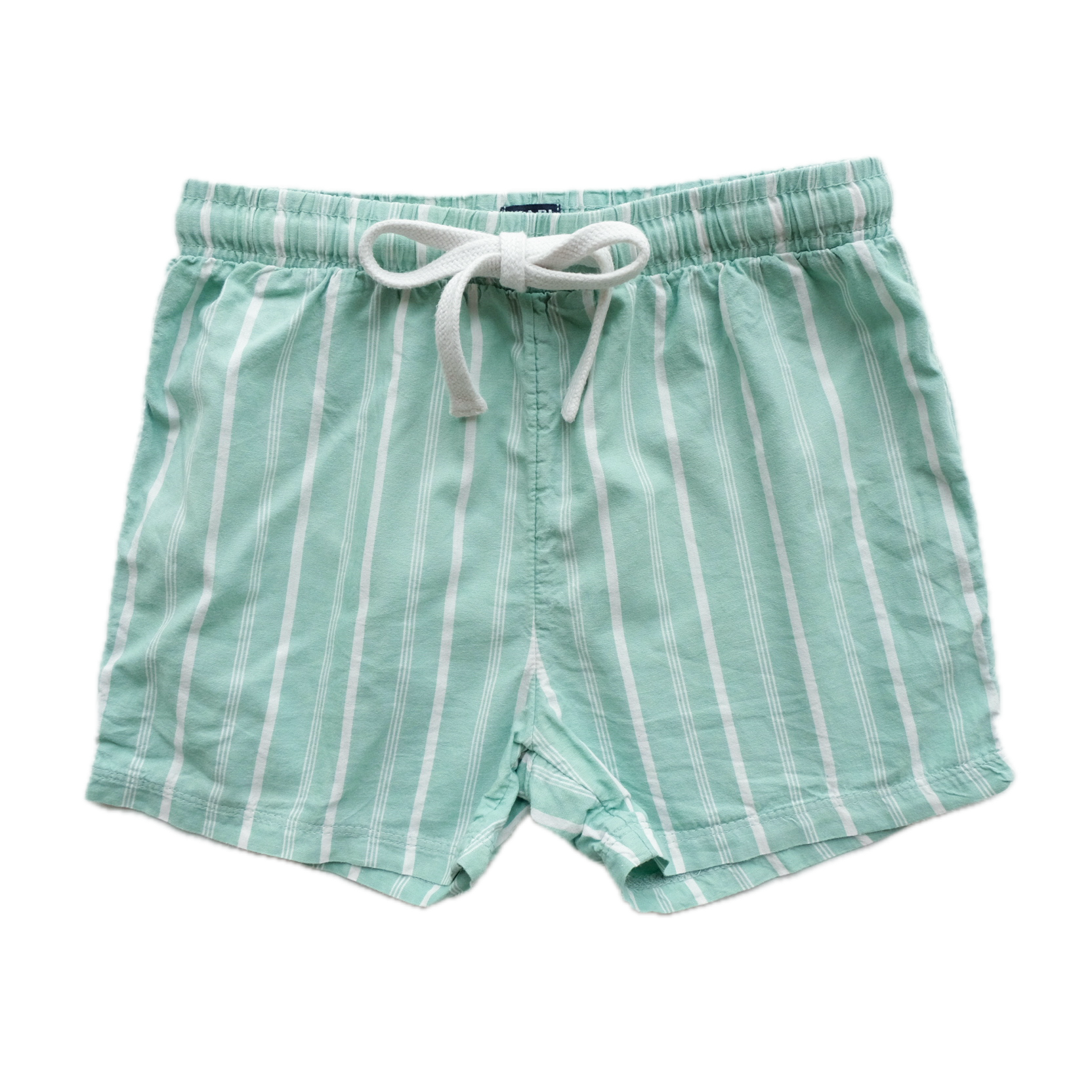 Short en coton léger, coloris vert d'eau, rayures blanches all over. Taille élastiquée + cordon de serrage.