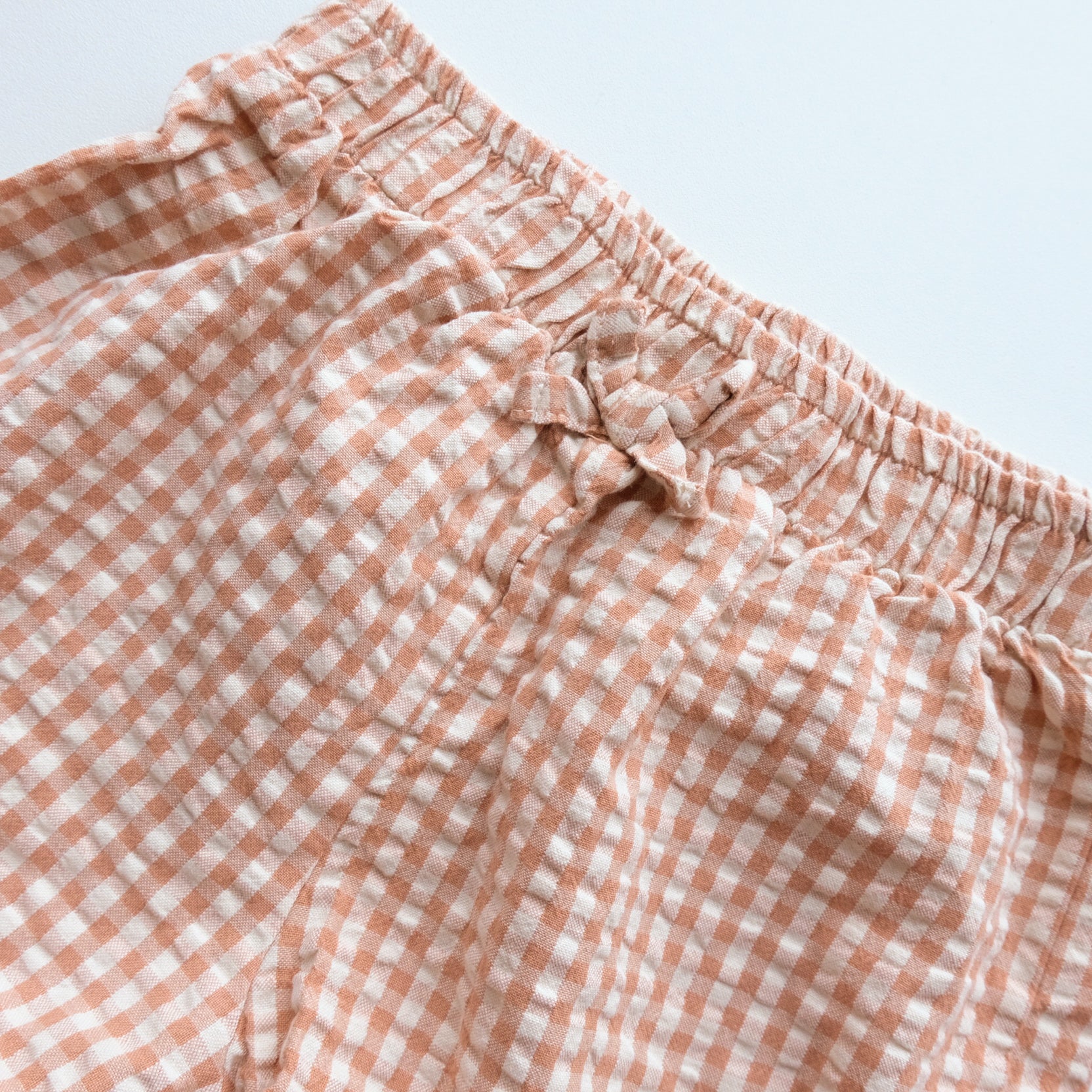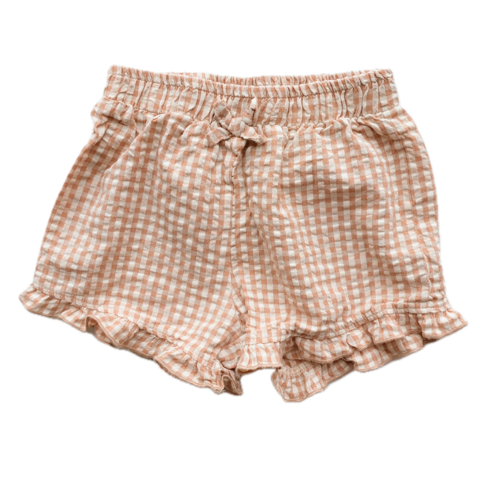 Short en coton, vichy beige, noeud fantaisie à la taille et petits volants froufrous sur la longueur.