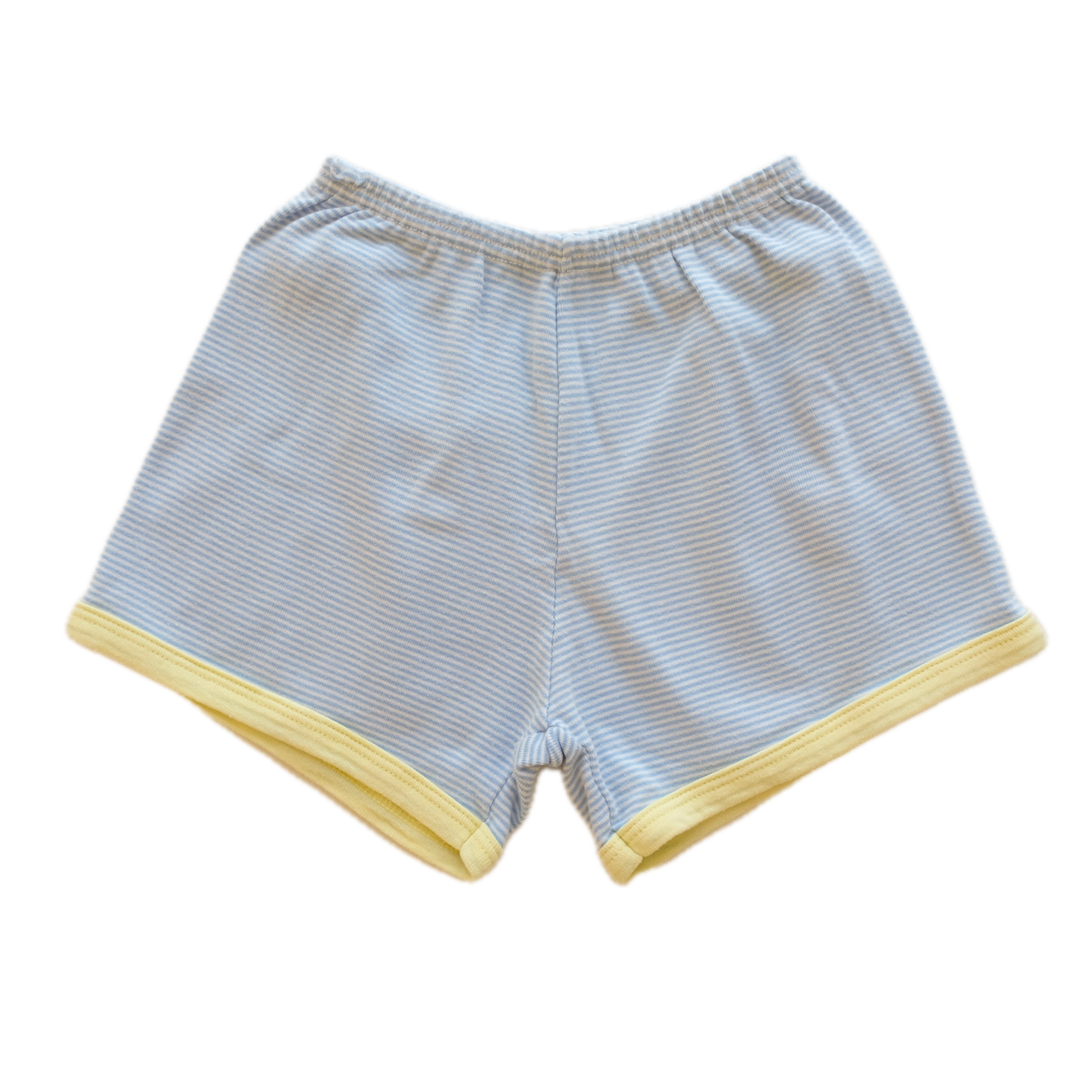 Short de pyjama en coton léger, milleraie blanc et bleu clair et jaune sur la longueur. Confortable et léger, parfait pour l'été.