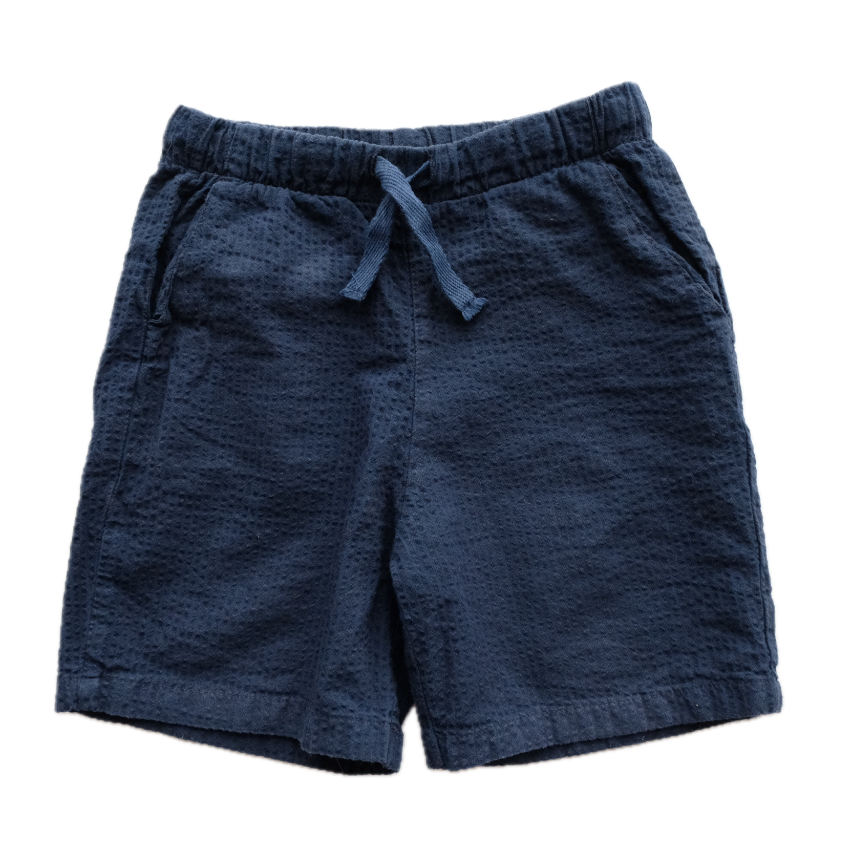 Short en coton gaufré texturé, coloris bleu marine uni. Cordon de serrage à la taille. Très sympa !