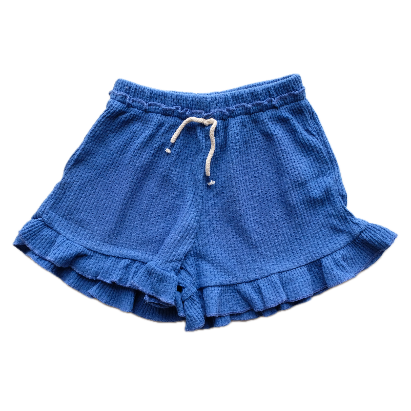Short en coton gaufré, coloris bleu foncé. Cordon de serrage à la taille. Volants froufrous sur la longueur. Très mignon !