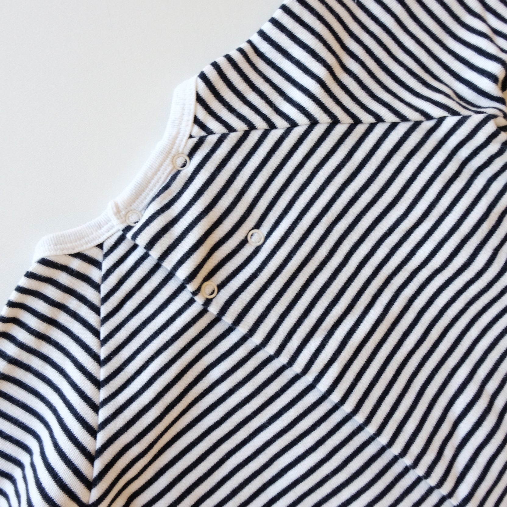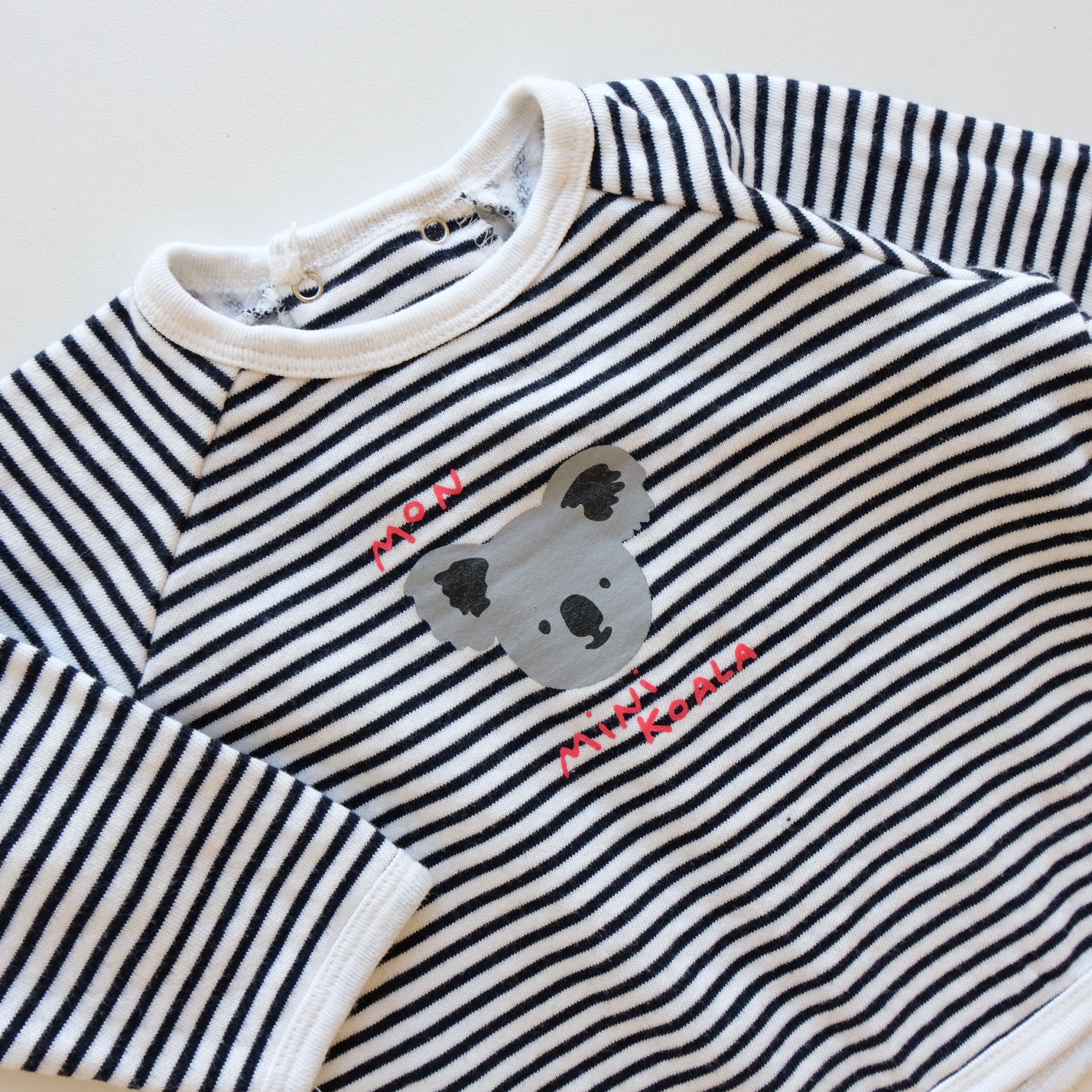 Sweat à manches longues en coton biologique, coloris blanc rayures bleu marine all over esprit marinière. Imprimé koala au devant. Large ouverture dans le dos avec 4 boutons pressions. Mixte.