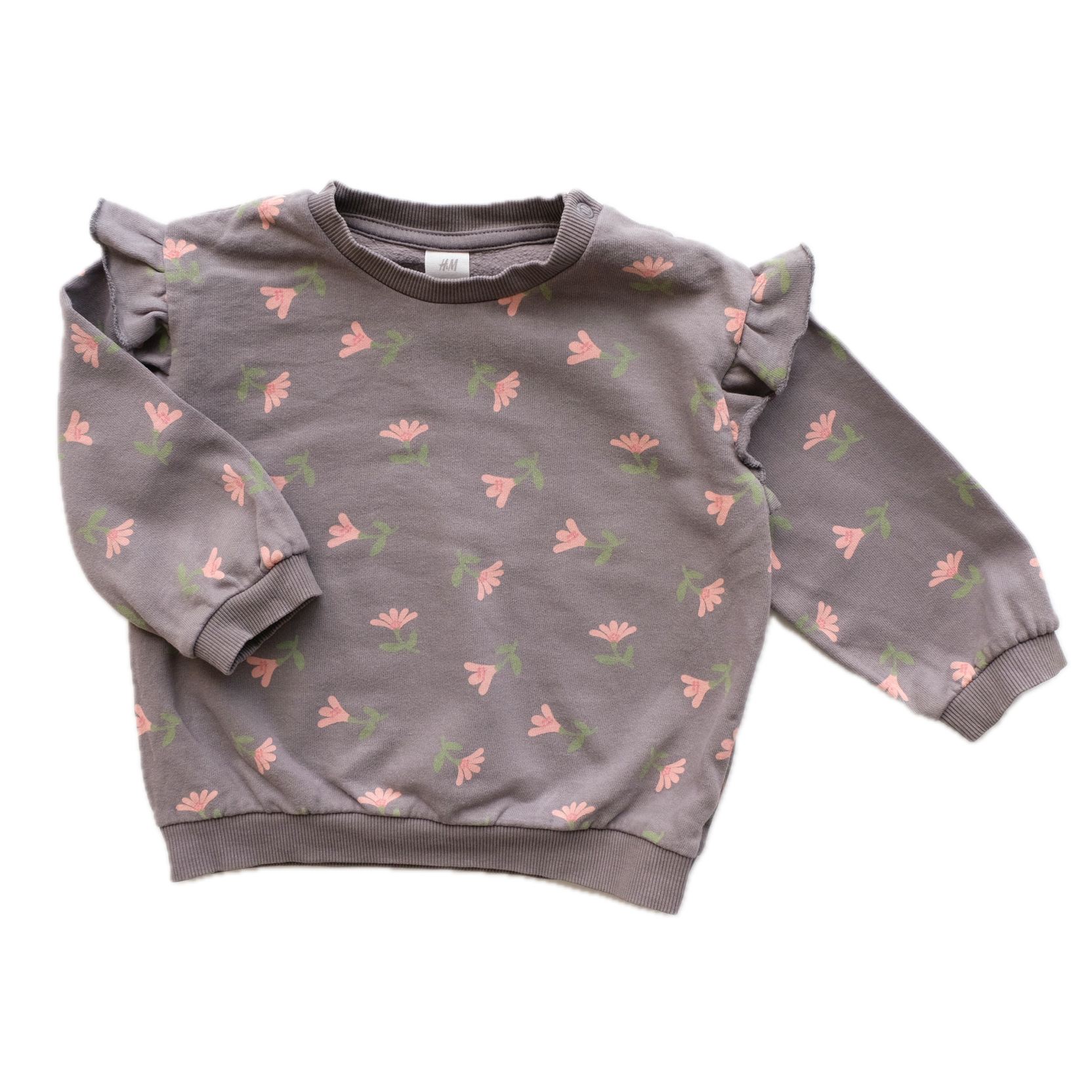 Sweat à manches longues en coton, coloris gris avec imprimé fleur all over. Petits volants aux épaules. Finitions bords côtes.