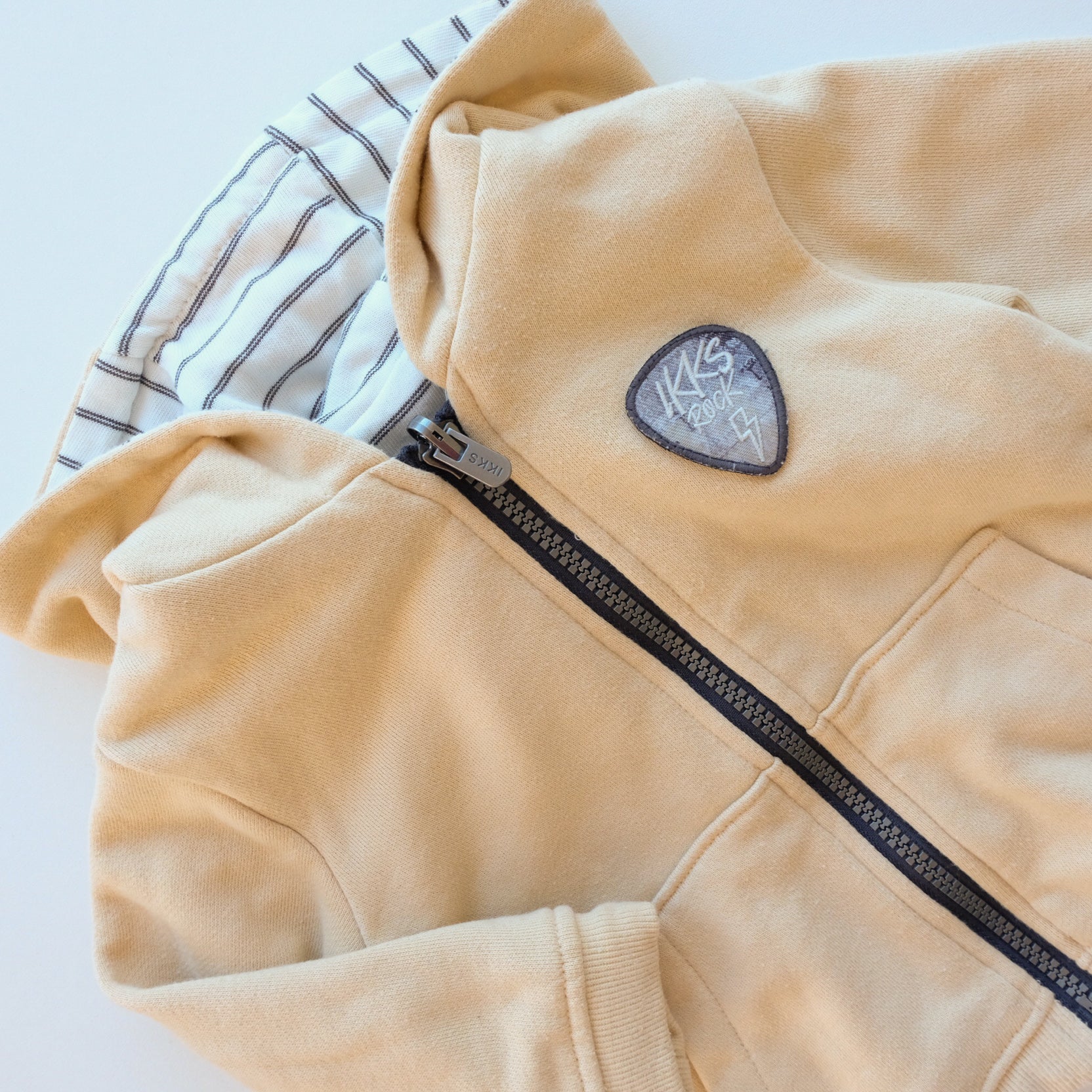 Sweat à manches longues en coton, réversible : une face coloris jaune pale et une face coloris blanc rayures fines all over. Capuche intégrée, zip au devant.