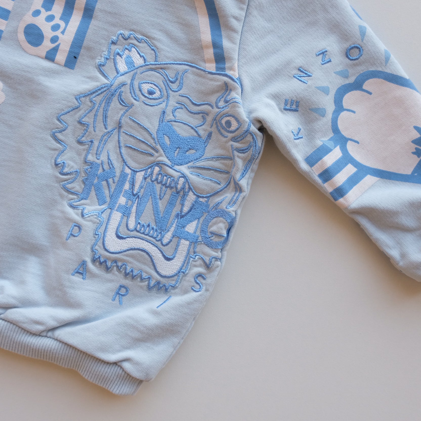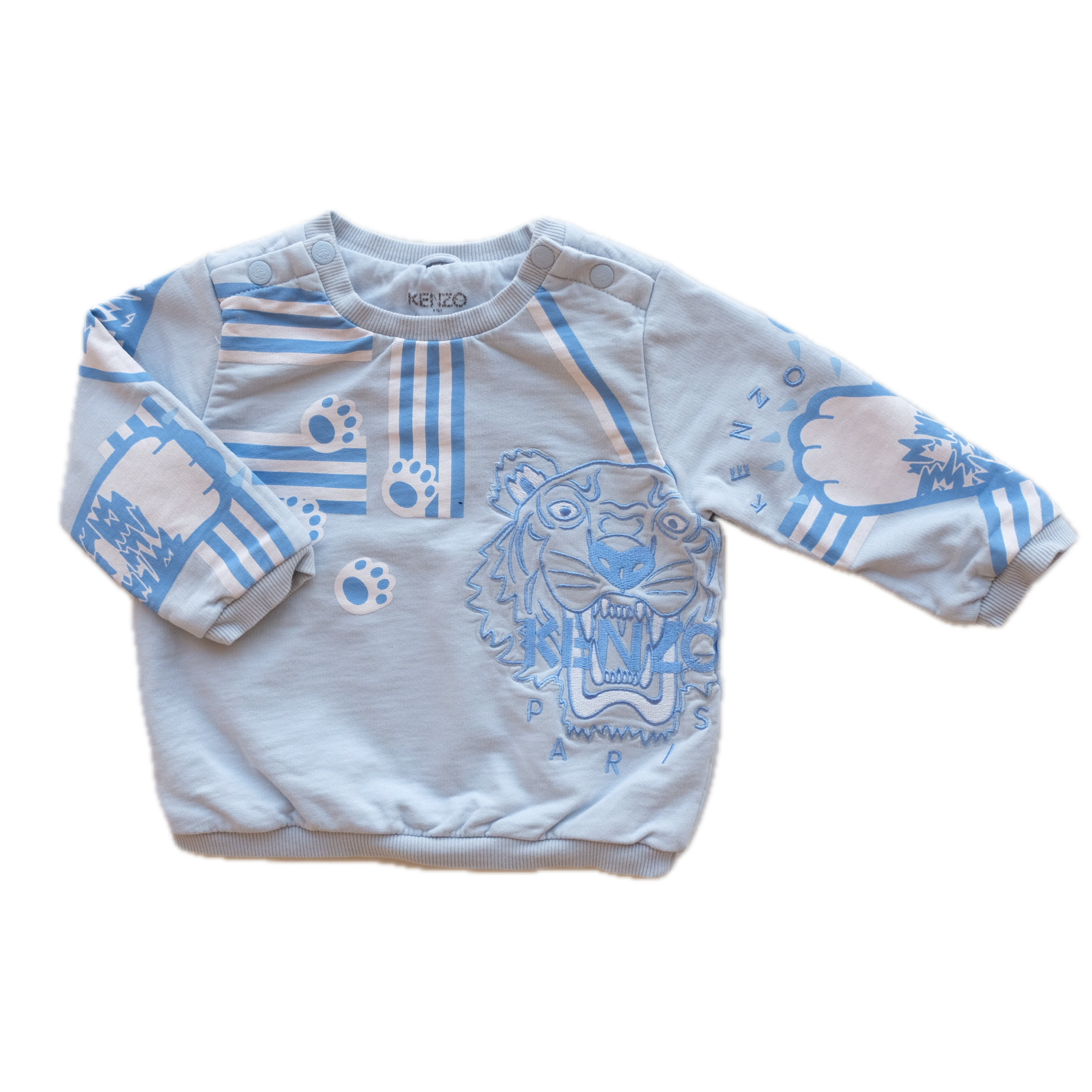 Sweat à manches longues en coton biologique, coloris bleu clair et blanc. Imprimé tigre au devant. Boutons pressions à l'épaule.