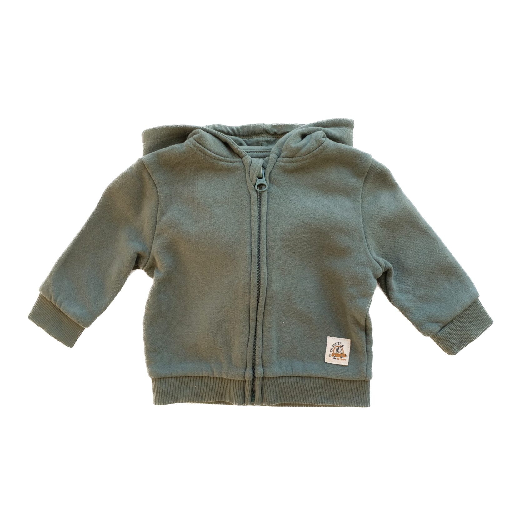 Gilet à manches longues, zippé au devant, capuche intégrée. Coloris vert foncé uni. Finitions bords côtes.