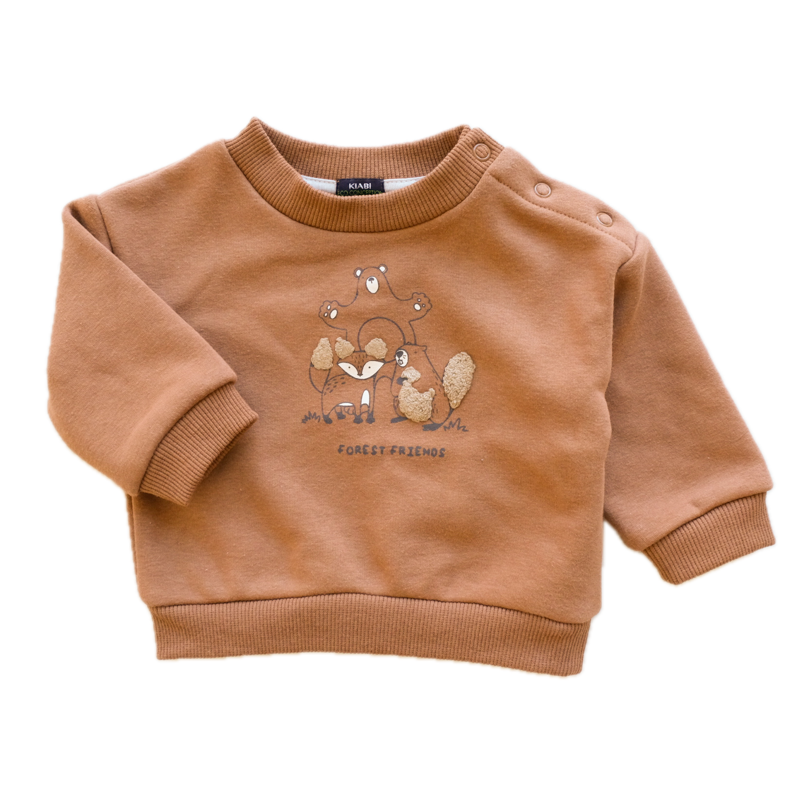 Sweat à manches longues en coton, coloris marron, finitions bords côtes. doublure intérieure en molleton. Imprimé animaux de la forêt au devant. Boutons pressions à l'épaule. Adorable !