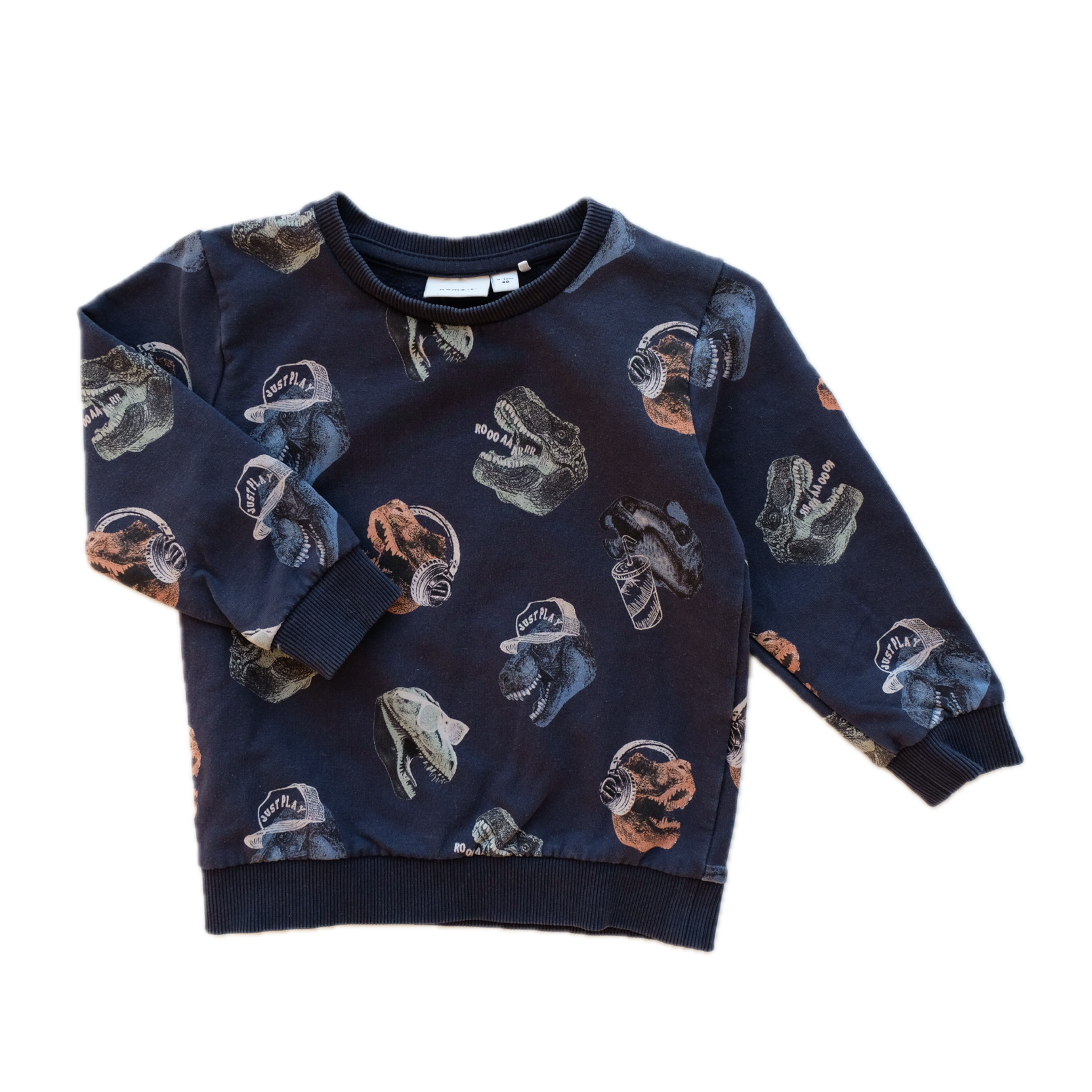 Sweat à manches longues en coton, coloris bleu marine, finitions bords côtes. Imprimé dinosaures all over.