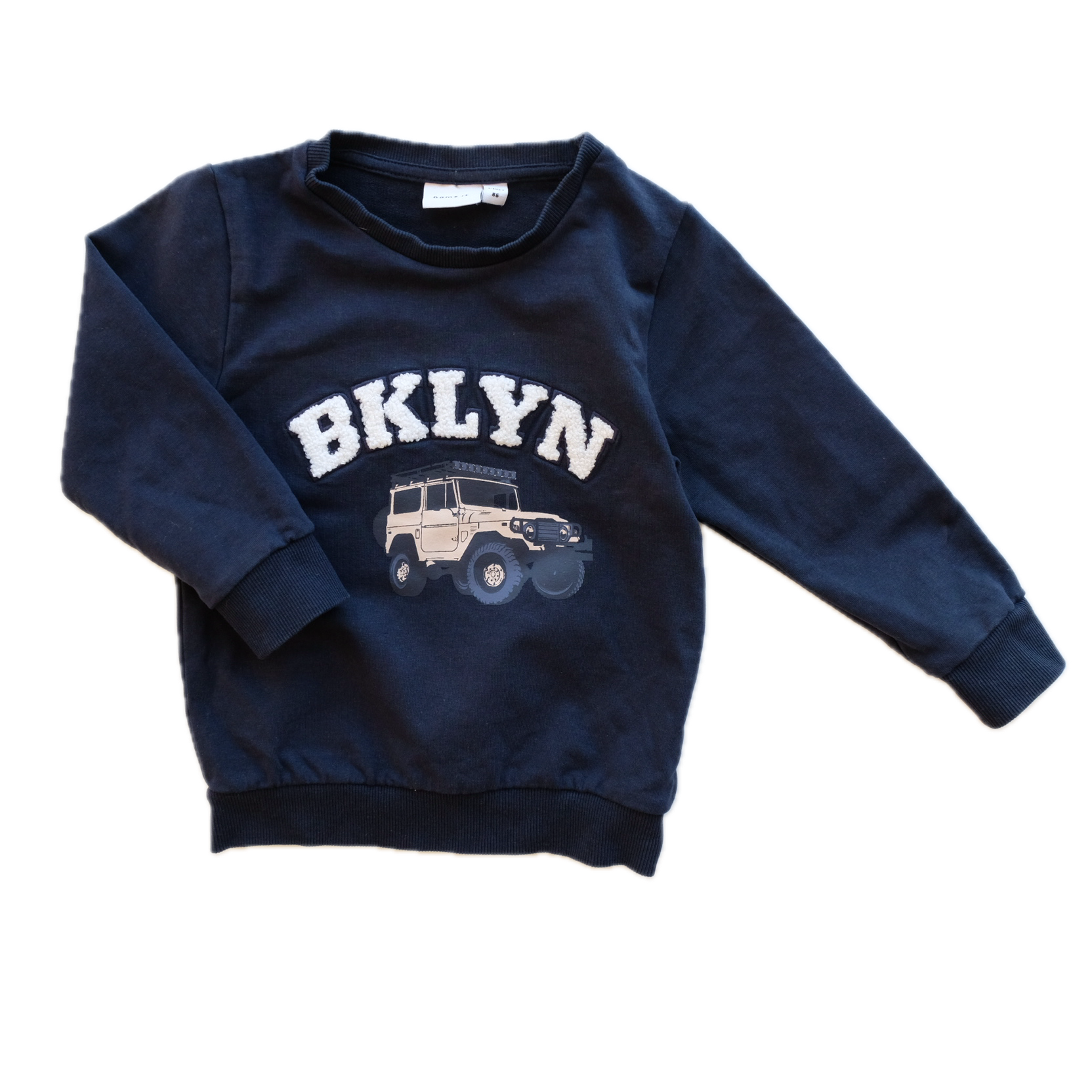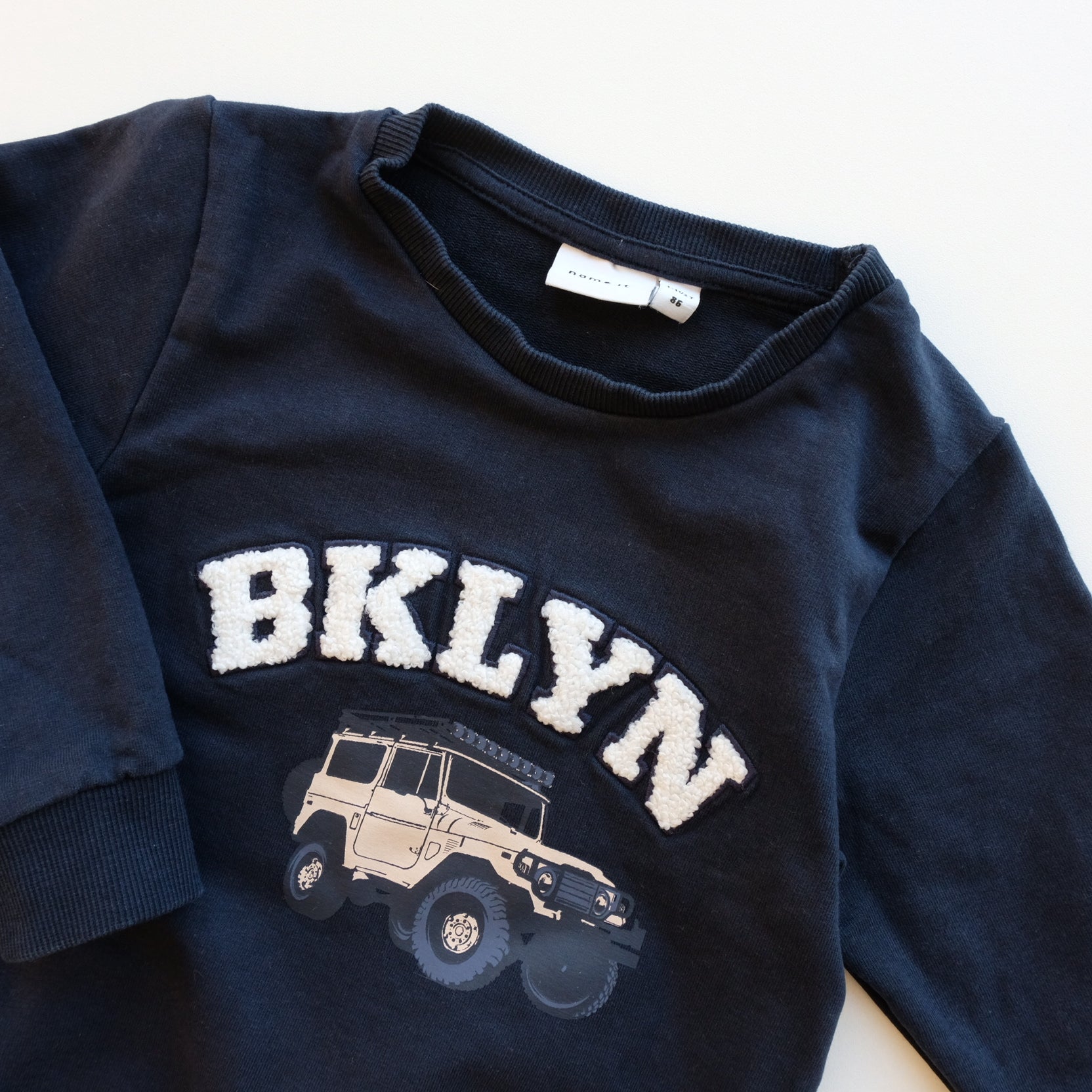 Sweat à manches longues en coton, coloris bleu marine, inscription Brooklyn en tissu bouclettes au devant. Très sympa !