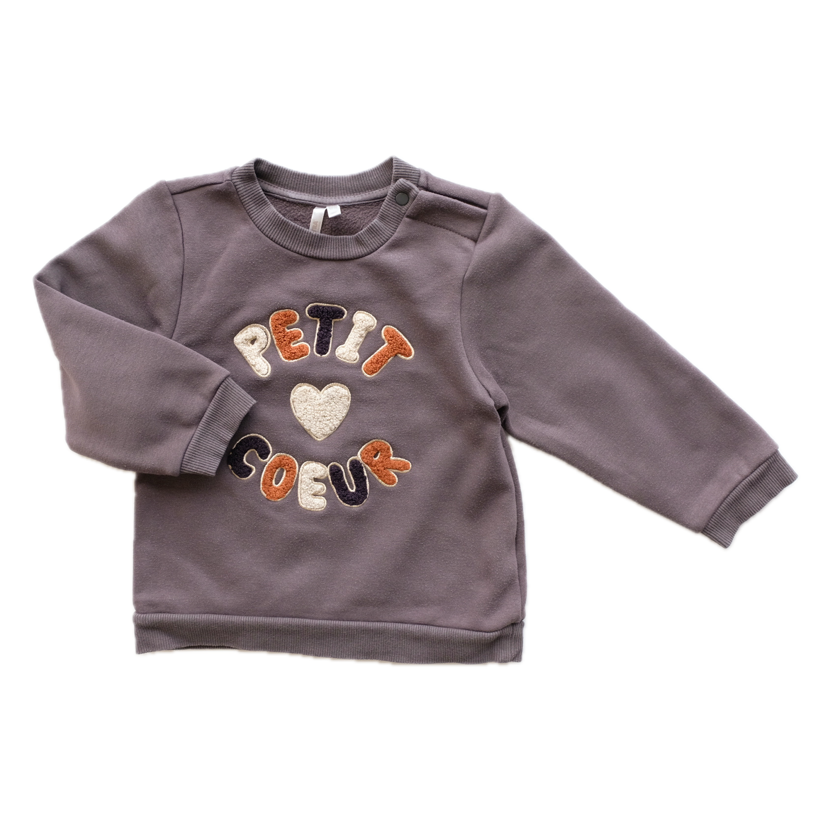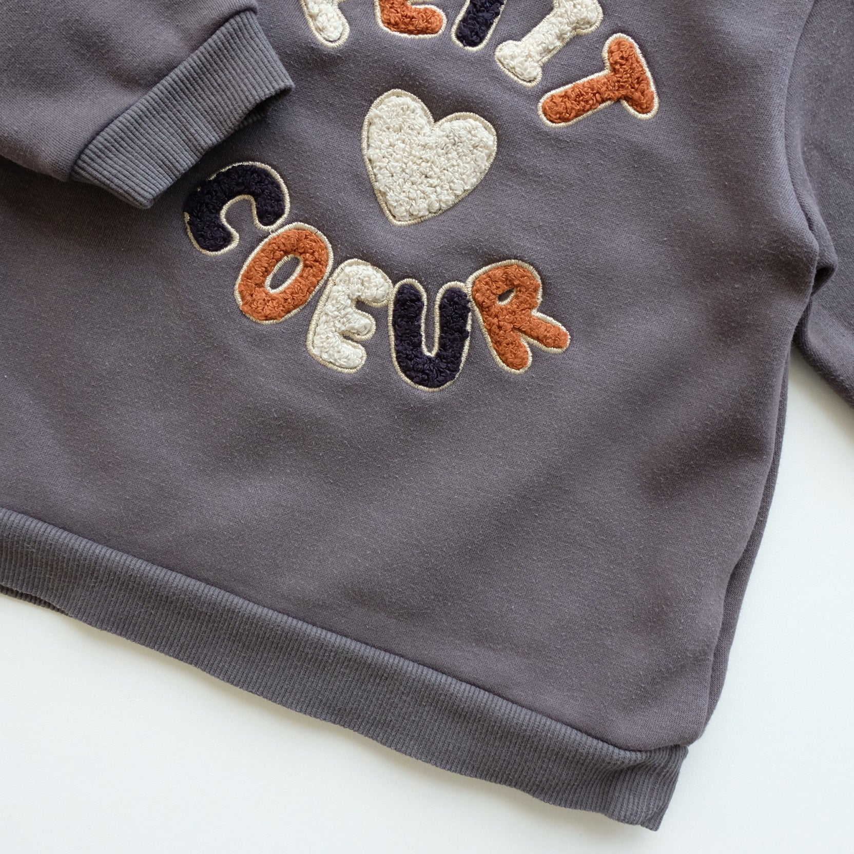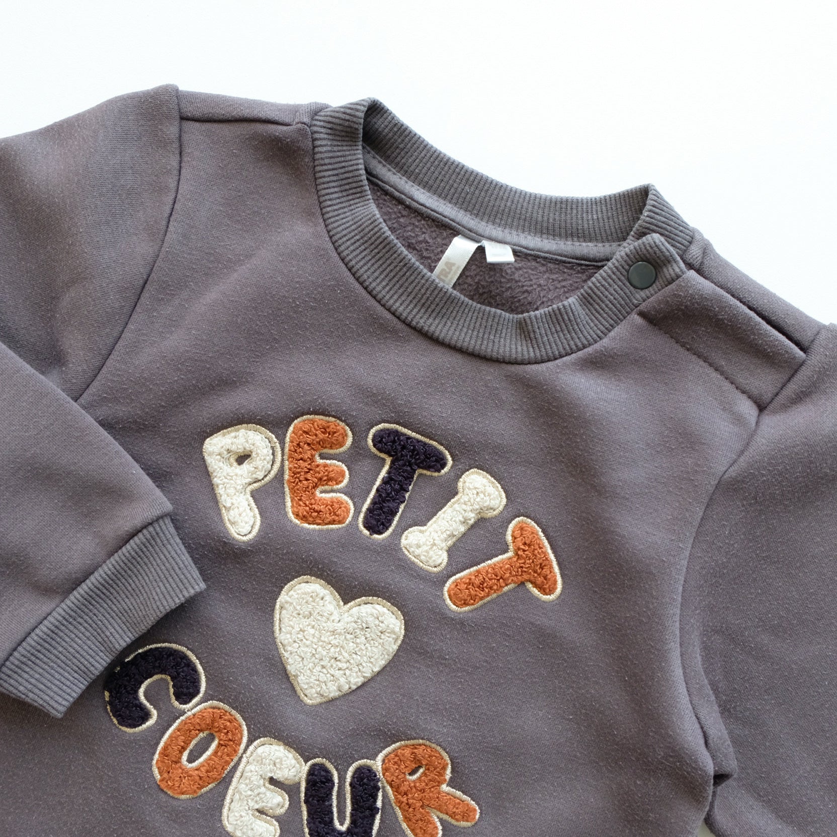 Sweat à manches longues en coton, coloris gris foncé. Inscription "petit coeur" au devant en lettre bouclettes. Boutons pressions à l'épaule.