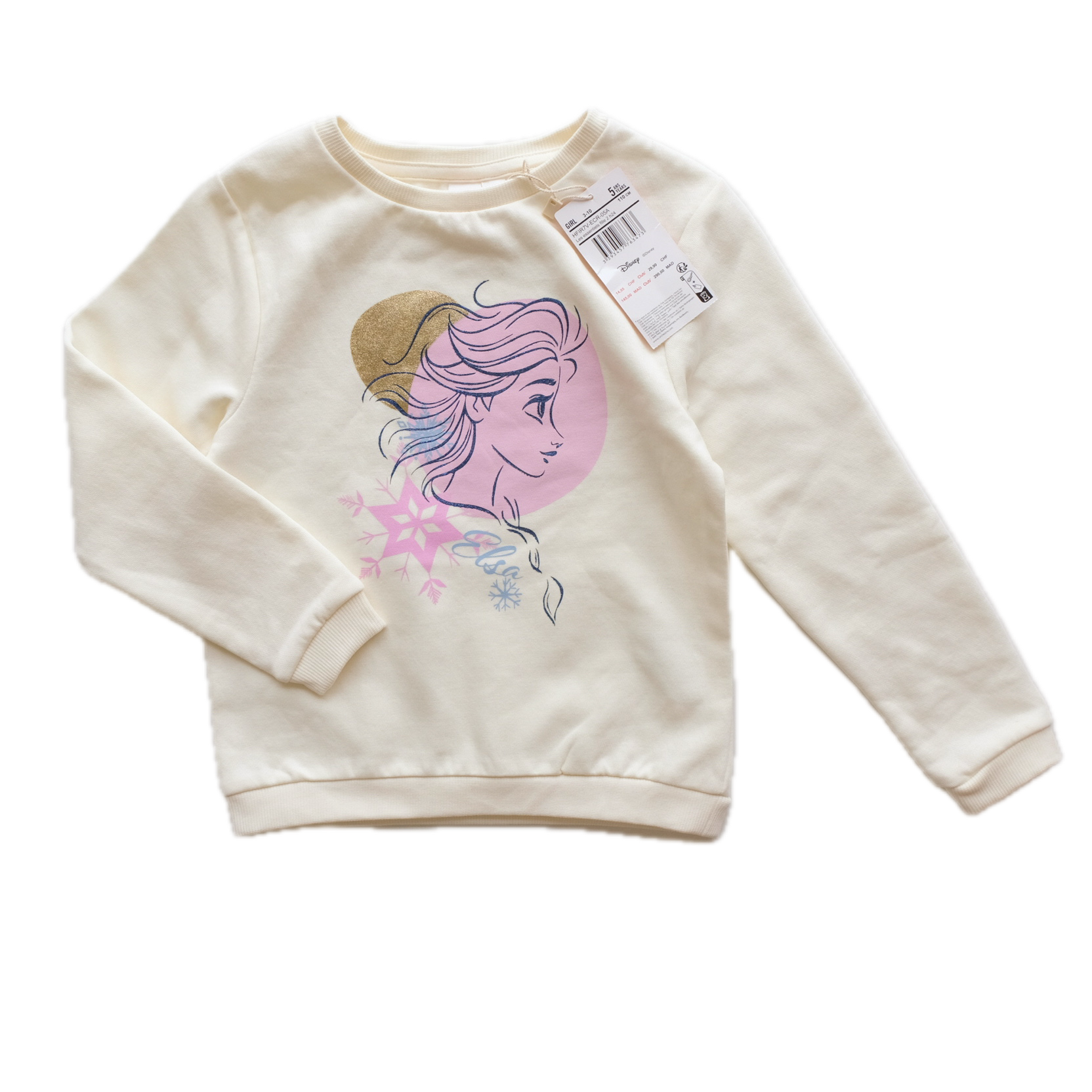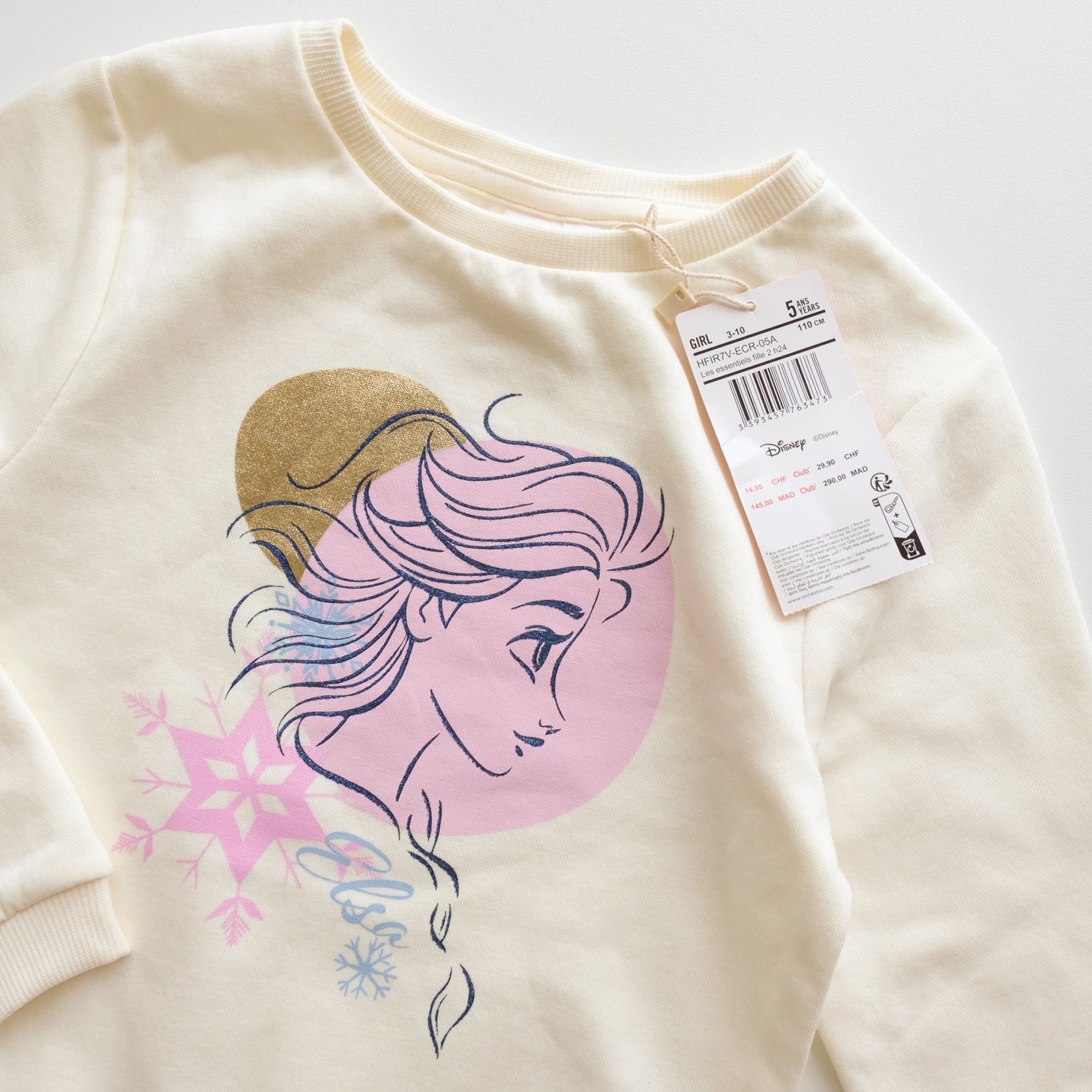 Sweat à manches longues en coton, coloris crème. Collection Disney, imprimé Reine des neiges au devant. finitions bords côtes. Neuf avec étiquette.