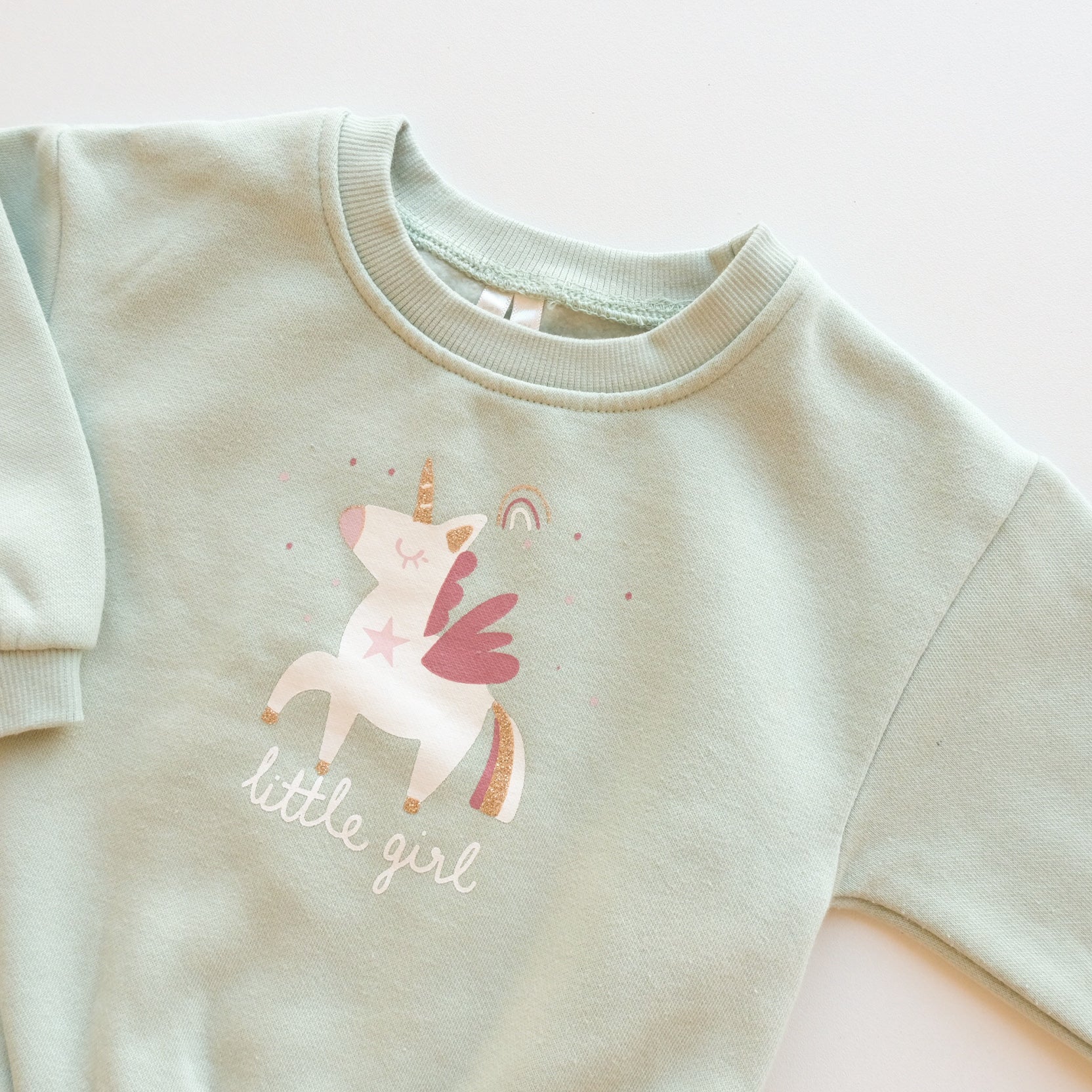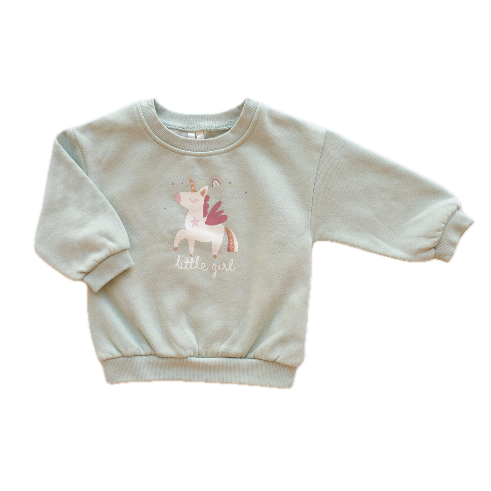 Sweat à manches longues en coton, coloris vert d'eau. Finitions bords côtes. Imprimé licorne au devant.