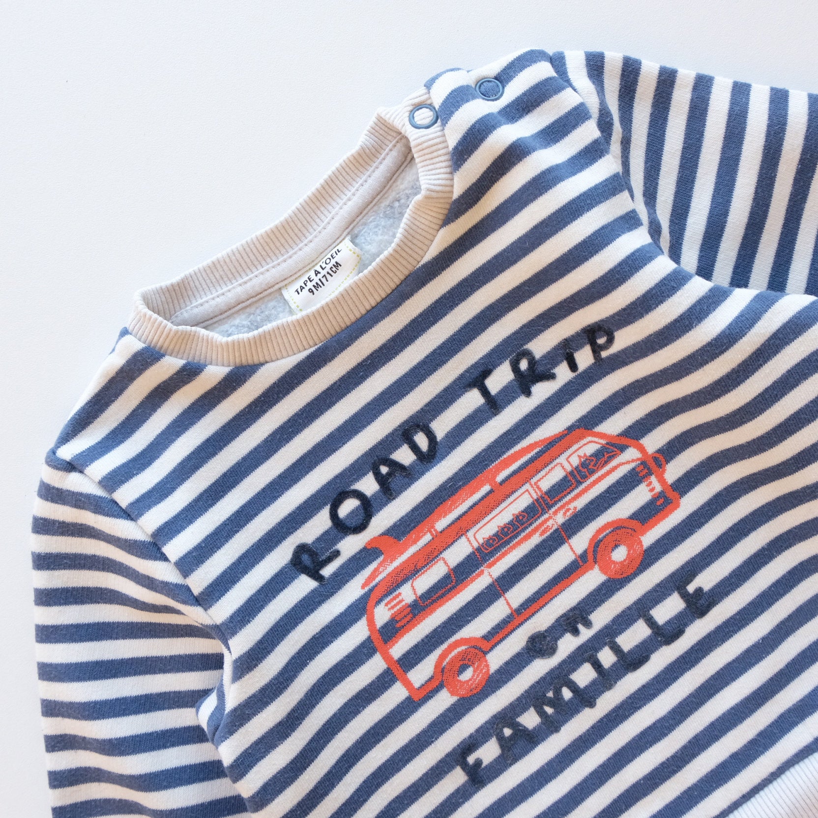 Sweat à manches longues en coton, coloris blanc et bleu rayures all over. Finitions bords côtes. Motif van avec inscription au devant "road trip en famille".