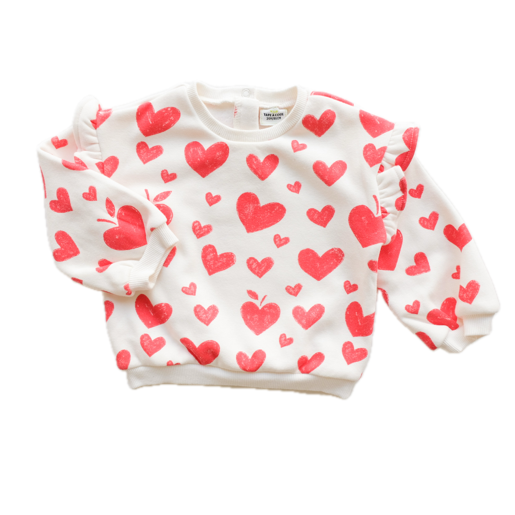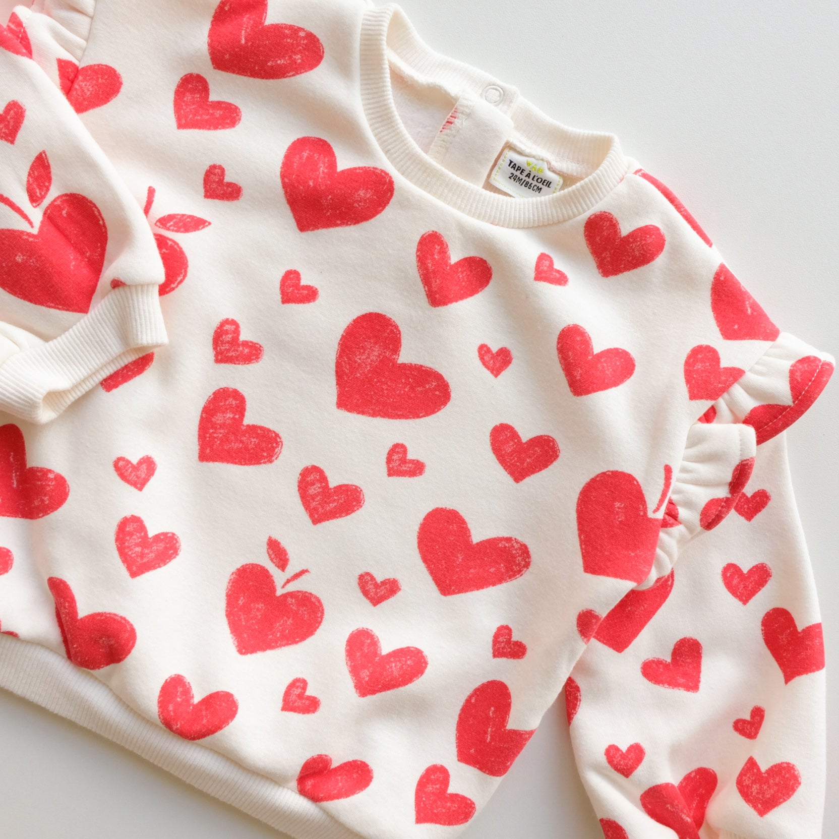 Sweat à manches longues en coton, coloris blanc, imprimé coeurs rouges all over. Volants aux épaules. Finitions bords côtes. Doublure intérieure en molleton bien chaud. Boutons pressions en haut du dos. Très beau !