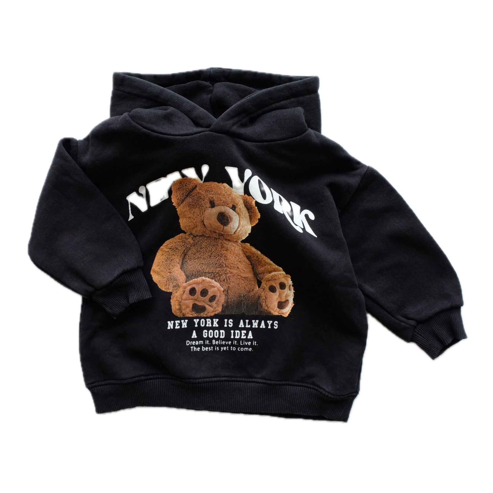 Sweat à manches longues en coton, coloris noir, imprimé ours brun, peluche au devant. Capuche intégrée. Inscription "New York" en blanc. Mixte.