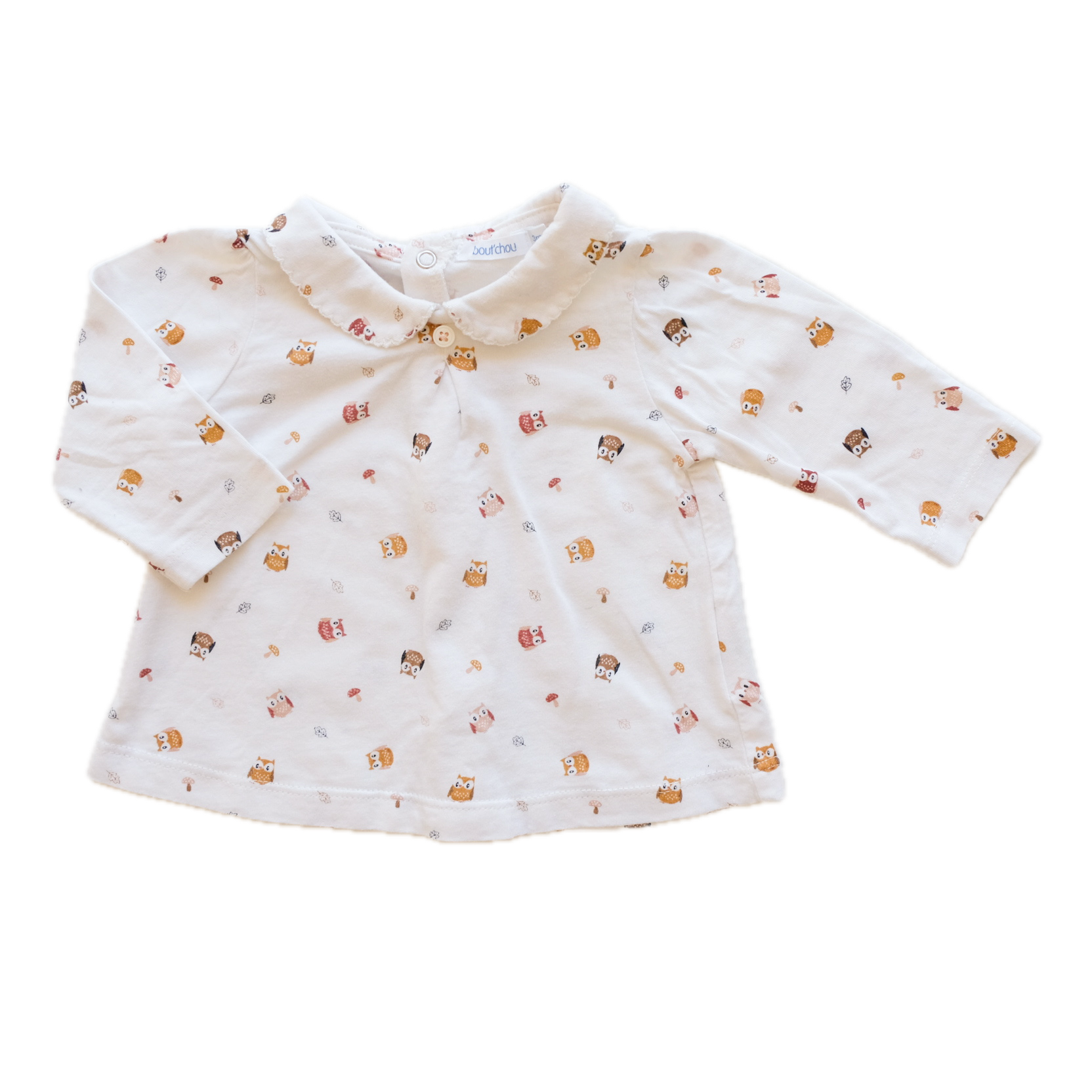 T-shirt à manches longues en coton, coloris blanc, imprimé automnal avec hibou et champignons all over. Joli petit col dentelé. Boutons pressions tout le long du dos. Adorable !