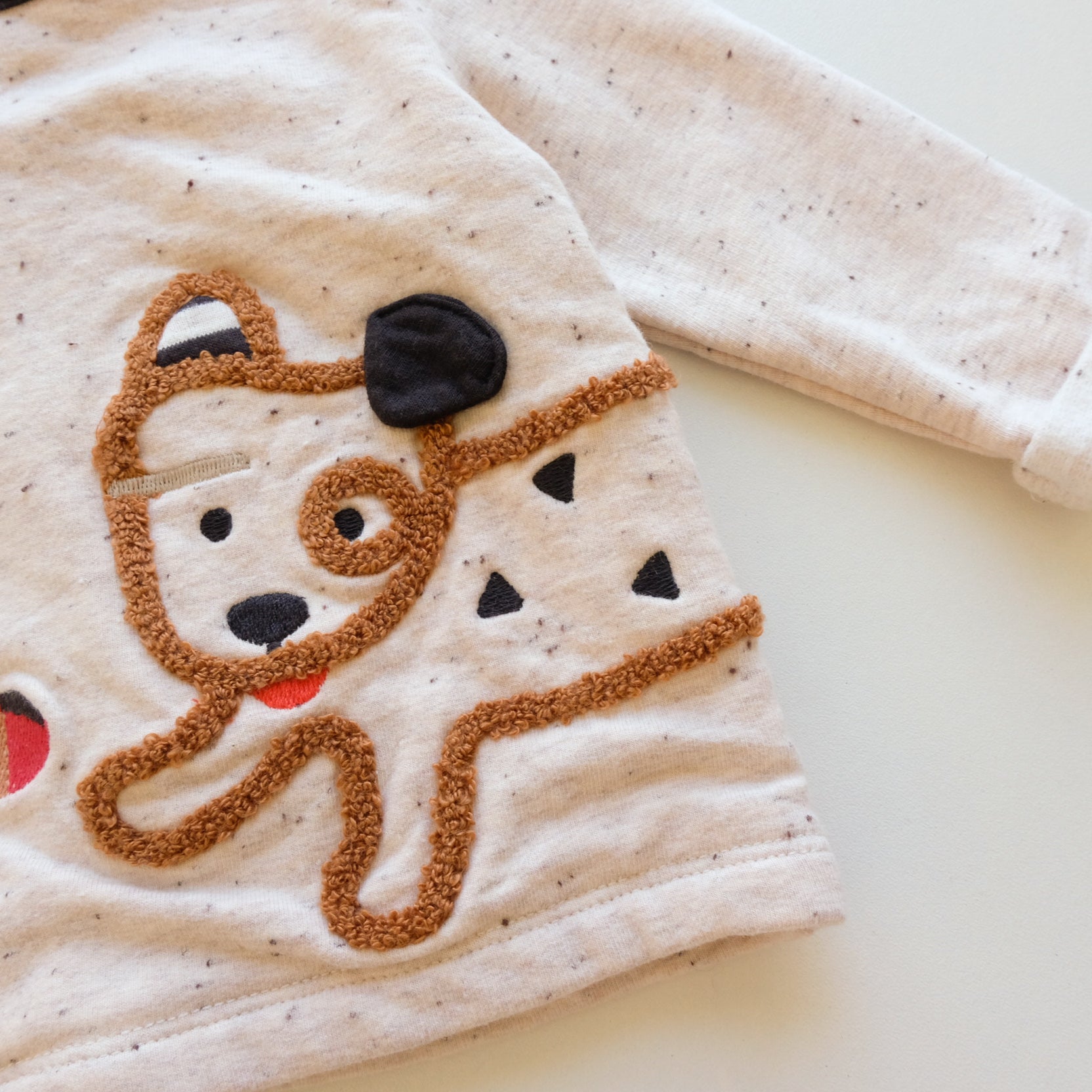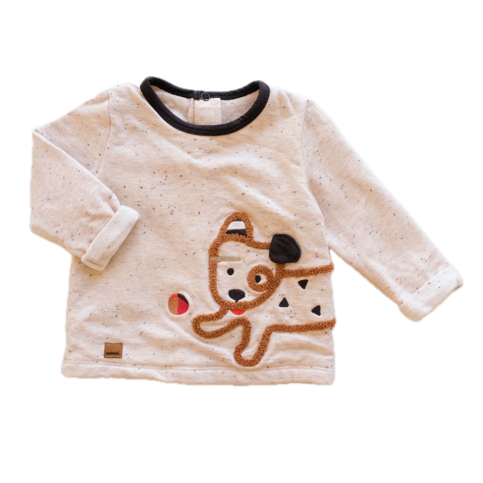 T-shirt à manches longues épais, bien chaud, coloris beige chiné. Petit chien brodé au devant. Boutons pressions tout le long du dos.