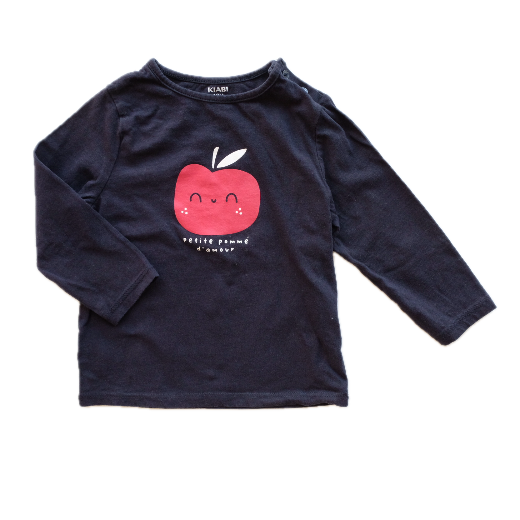 T-shirt à manches longues en coton, coloris bleu marine, imprimé pomme au devant. Boutonnière à l'épaule.