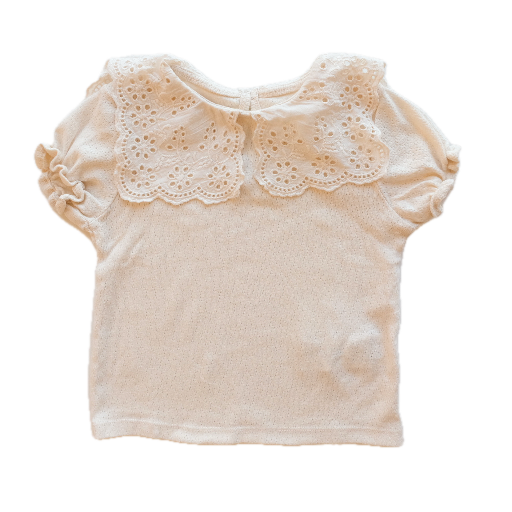 T-shirt à manches courtes en coton ajouré, coloris crème uni. Adorable et large col en broderies anglaises. Bouton oeillet en haut du dos.