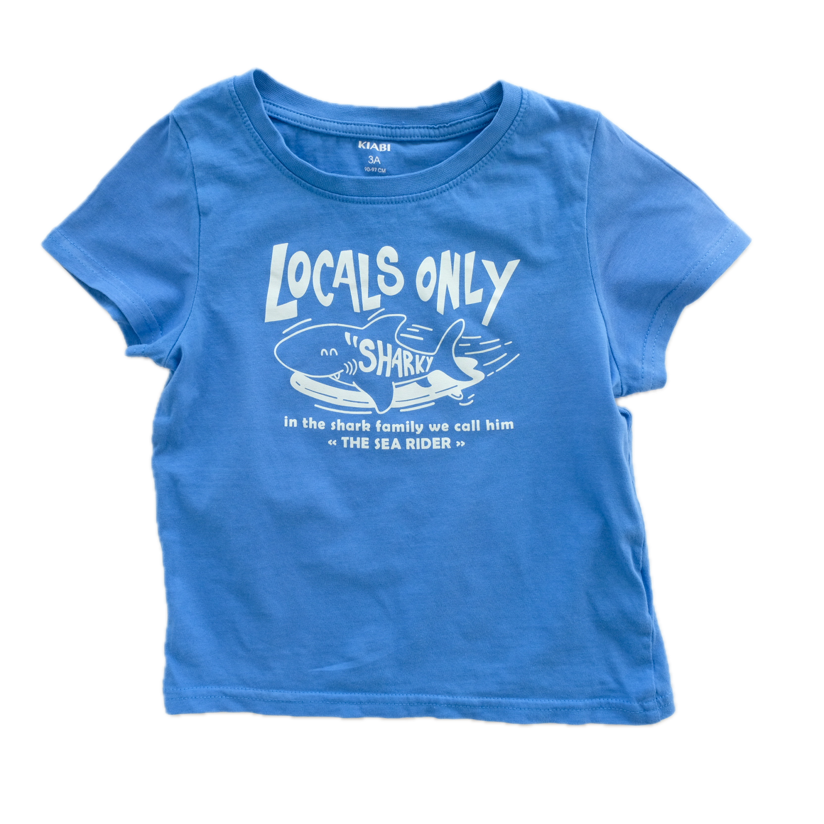 T-shirt à manches courtes en coton, coloris bleu, inscriptions blanches au devant. Thème requin et surf.