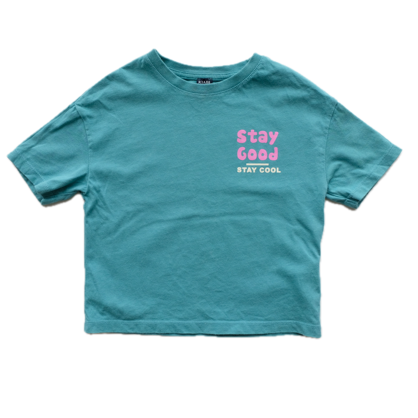 T-shirt à manches courtes en coton, coloris vert d'eau, inscription au devant et au dos en grand, blanc et rose : "Stay good, stay cool". Mixte.
