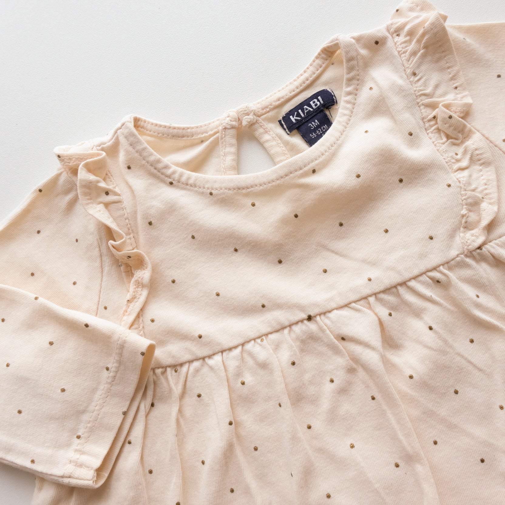 T-shirt à manches longues en coton, coloris écru, imprimé petits pois dorés all over. Petits volants aux épaules et bouton oeillet en haut du dos.