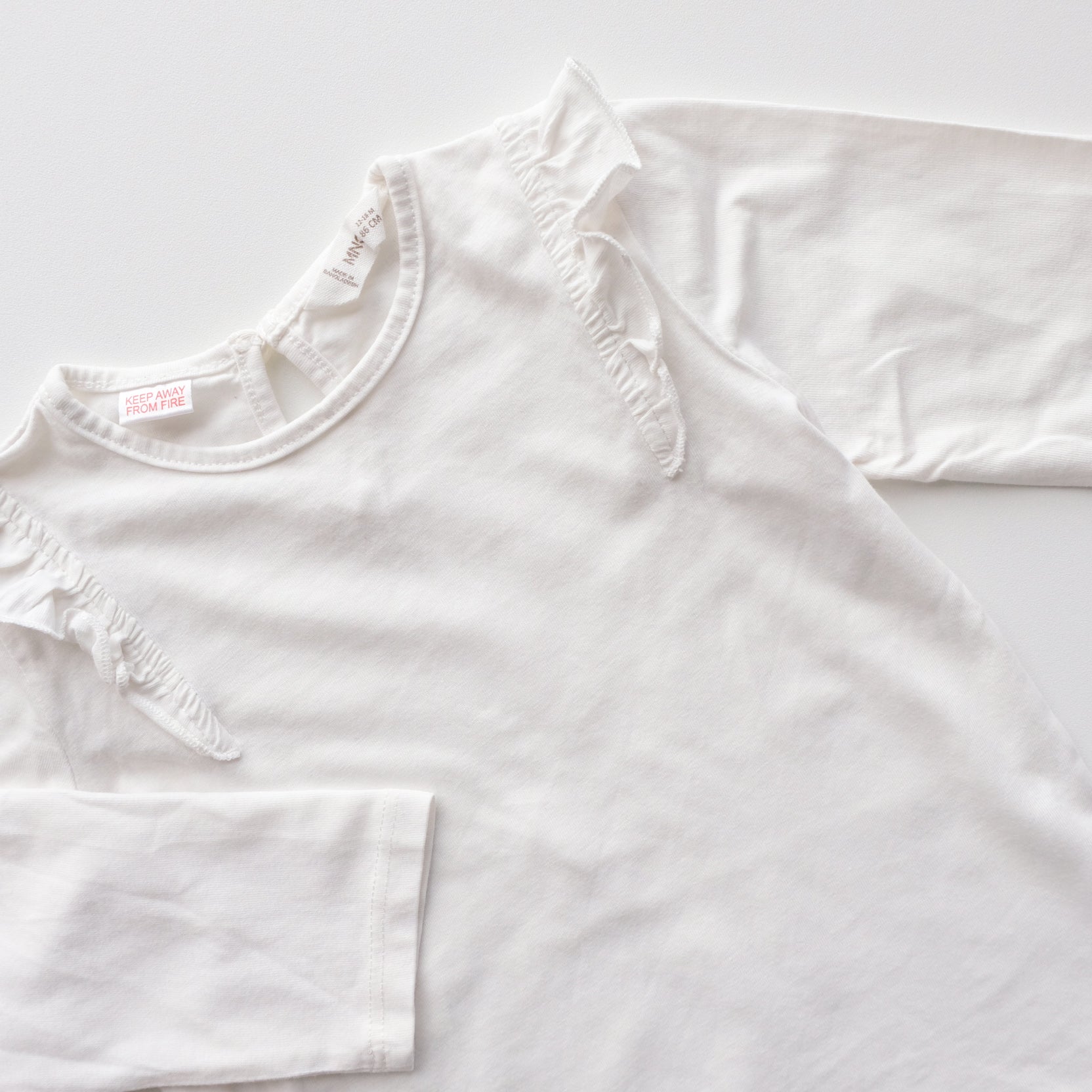T-shirt à manches longues en coton, coloris blanc. Volanté au niveau des épaules. Bouton oeillet en haut du dos.
