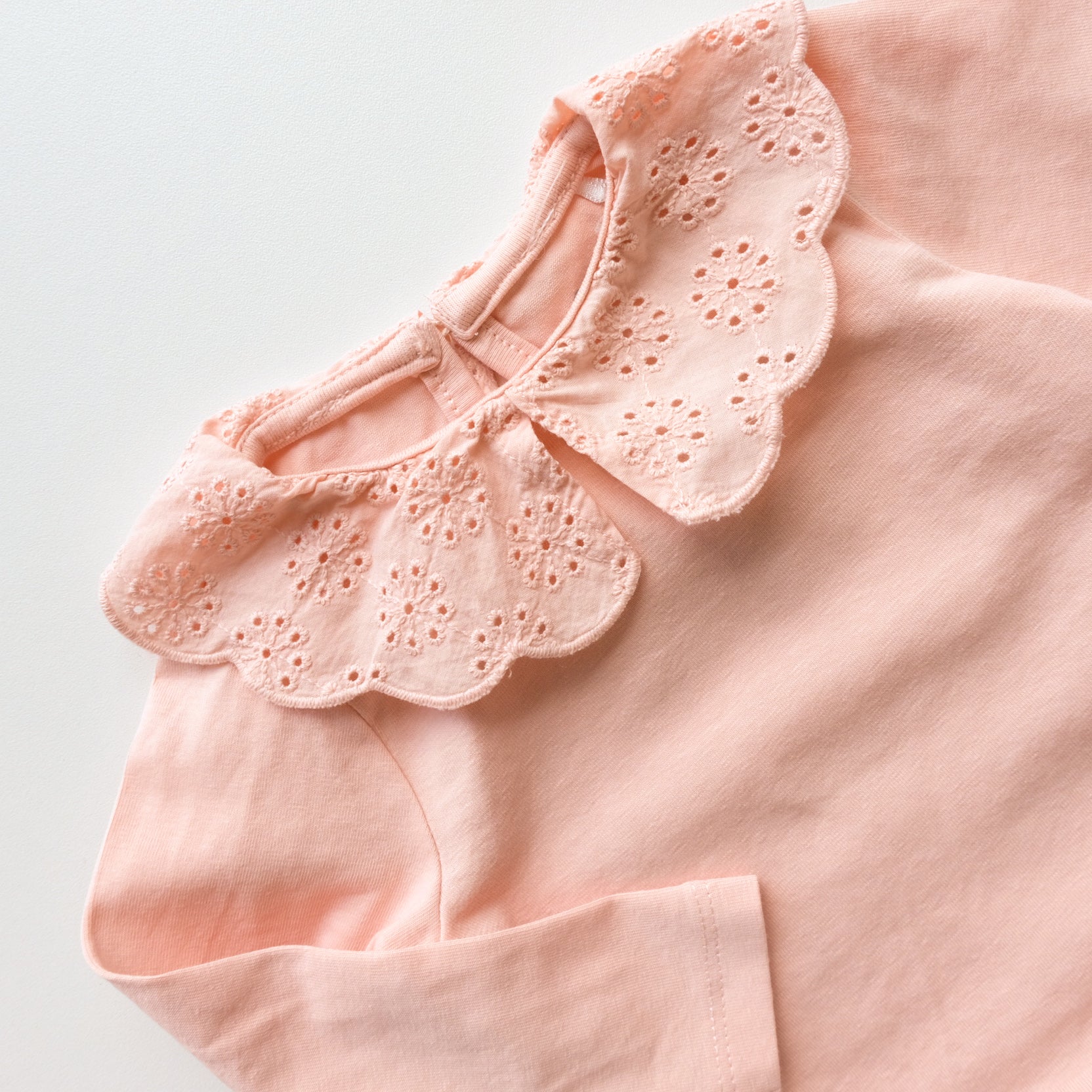 T-shirt à manches longues en coton, coloris rose uni, joli petit col en broderie aglaises. Bouton oeillet en haut du dos.