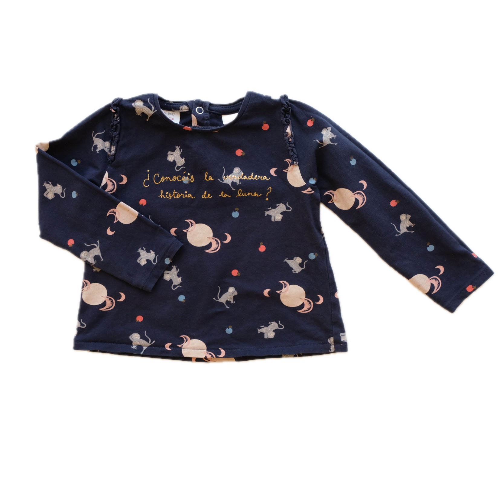 T-shirt à manches longues en coton coloris bleu marine. Imprimé petite souris grise et lune all over. Petits volants aux épaules. Trop mignon !