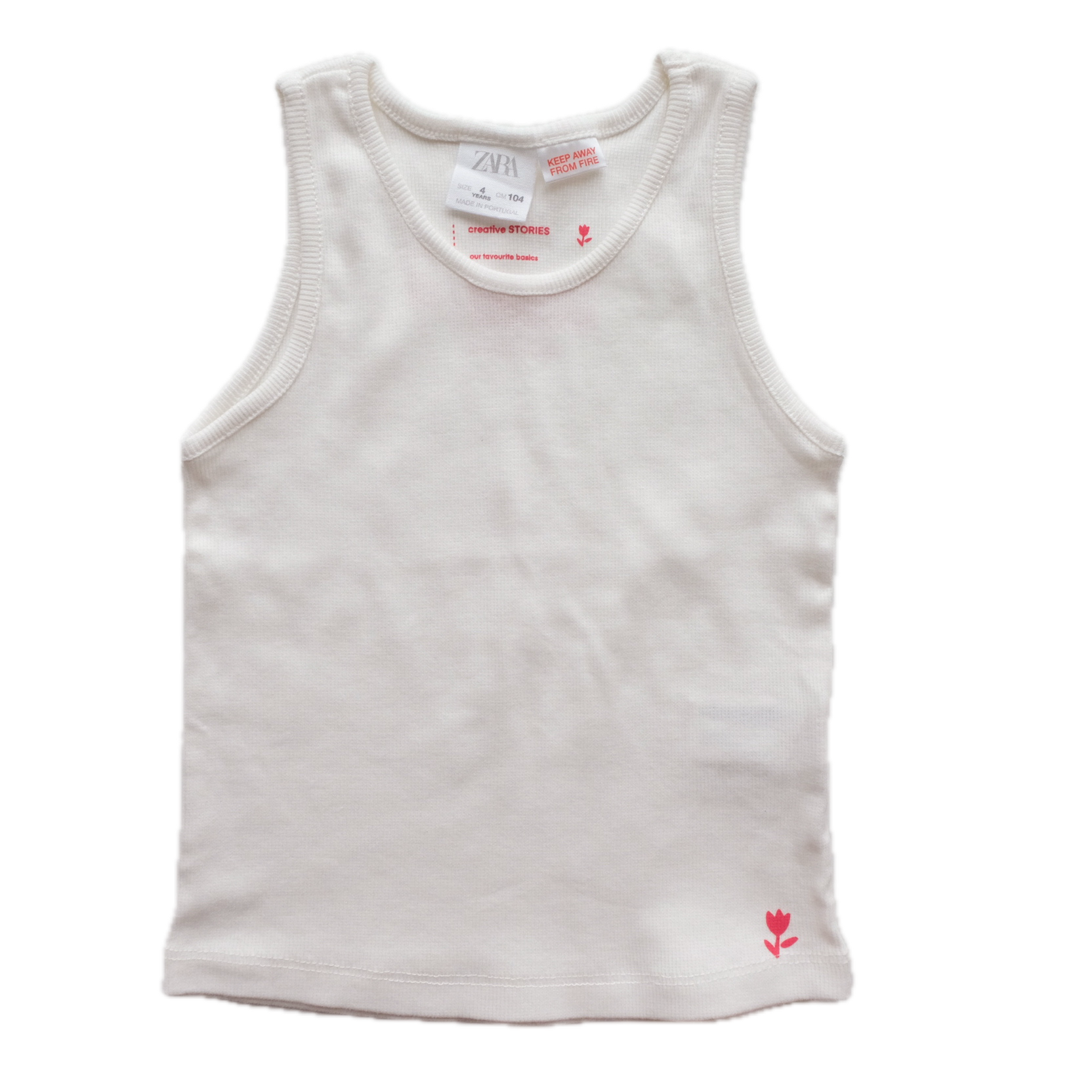 Top, débardeur en coton côtelé, coloris blanc uni. Imprimé petite tulipe rouge sur la longueur.